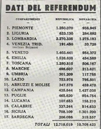 La partecipazione fu dell’85 percento degli aventi diritto e sancì: Repubblica 54,27%, Monarchia 45,73%. Tradotto in voti: 12.717.923/Repubblica e 10.719.284/ Monarchia. Una notazione: nel Lazio e nelle regioni del Sud prevalse la Monarchia.