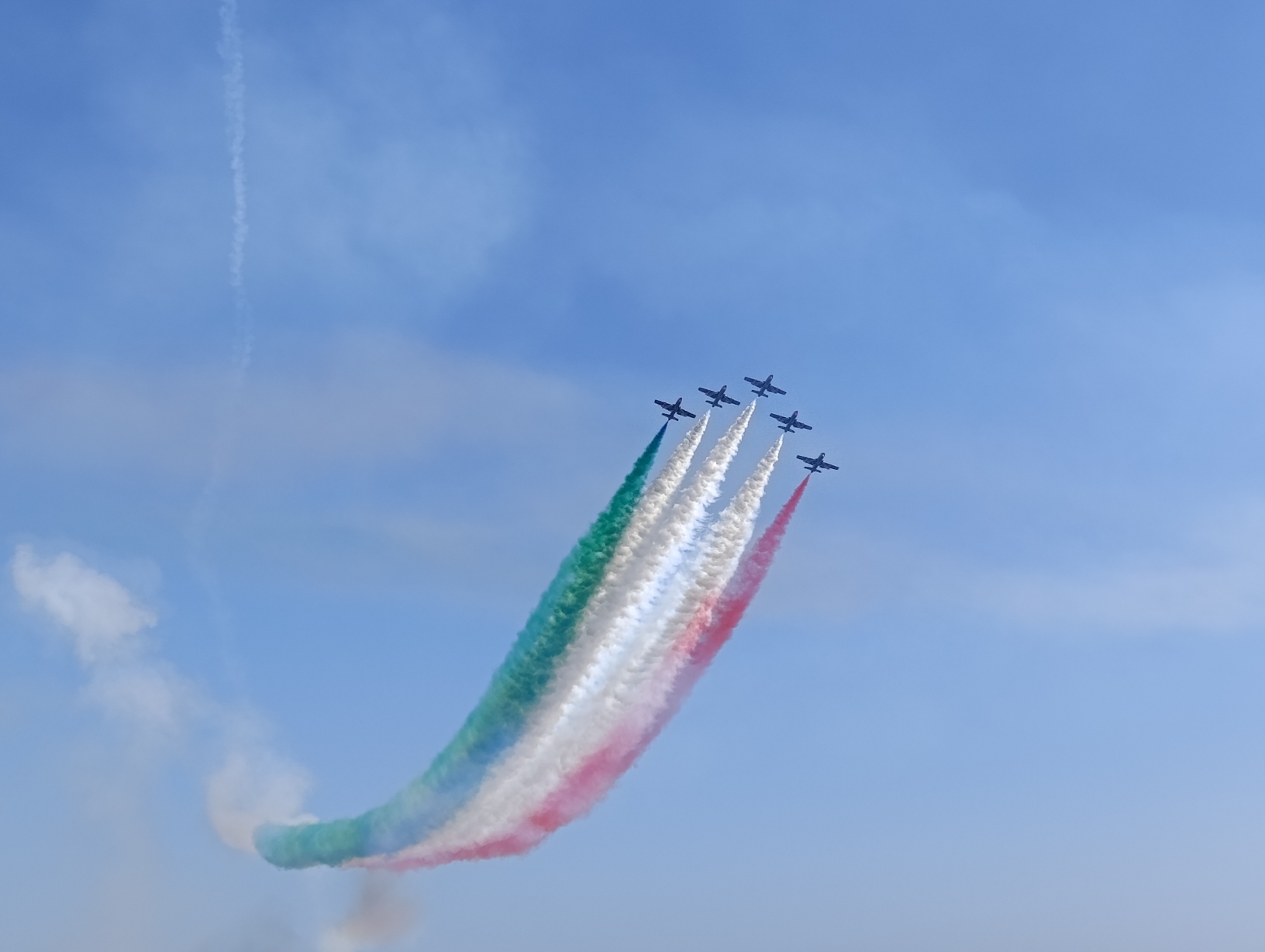 Sulle note della Turondot di Puccini, scandite dal ‘nessun dorma’, le Frecce hanno effettuato l’ultimo passaggio con cui hanno disegnato un enorme tricolore nel cielo sopra il mare di Ladispoli; sarà stato l’effetto del sole e del sudore, ma guardandomi intorno, mi è sembrato che non ero il solo ad avere gli occhi lucidi.