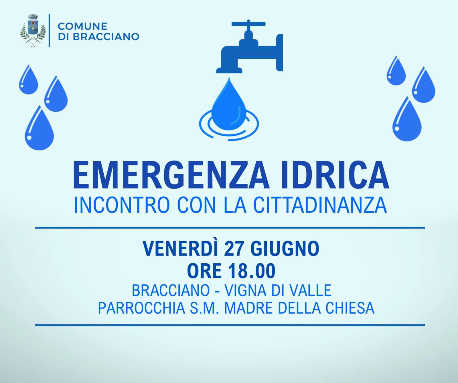 Venerdì 27 giugno alle ore 18, si terrà presso la Parrocchia S.M. Madre della Chiesa di Vigna di Valle un incontro tra l’amministrazione comunale e la cittadinanza sulla questione dell’emergenza idrica.