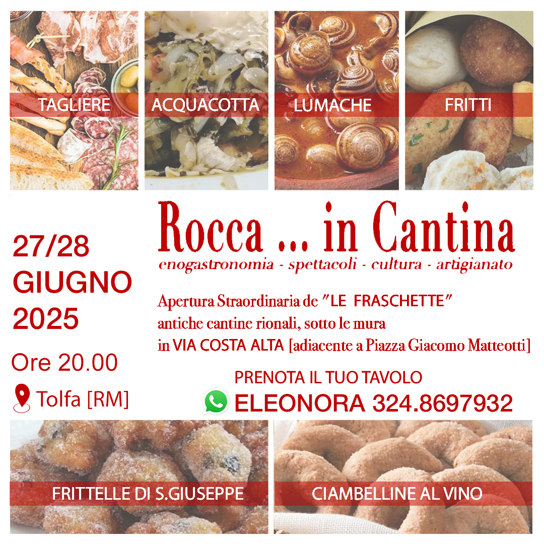 Il giorno 27/28 giugno a Tolfa, provincia di Rom, chiamato Rocca in Cantina. Un’apertura straordinaria nel weekend 27/28 giugno 2025, delle antiche cantine rionali sotto le mura ( chiamate in dialetto “Le Fraschette”).