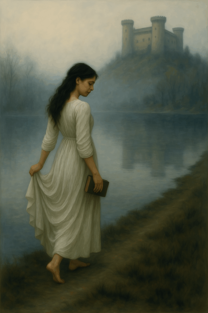 Ancora, quando la nebbia confonde i lineamenti della realtà, con il mio abito da notte, percorro le placide rive del silenzioso lago, sollevando lo strascico con la mano sinistra e nella destra ancora un libro di poesie che non ho più completato.