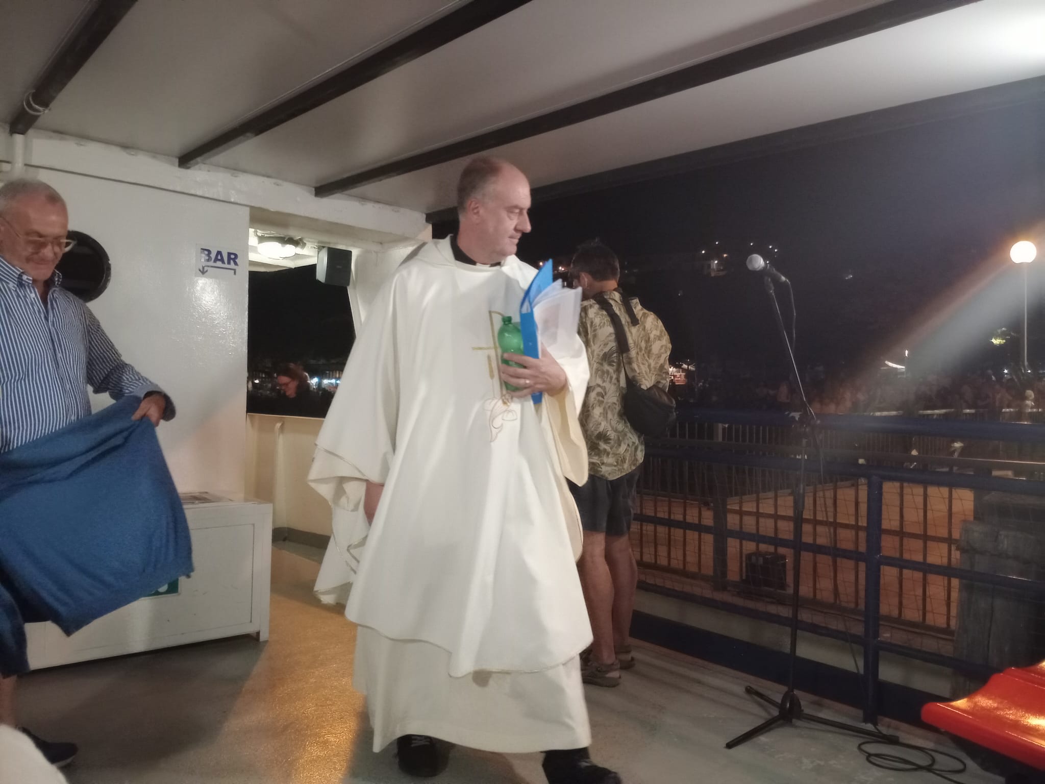 Anche l’aspetto liturgico è stato curato con grande attenzione: dalla processione accompagnata dalla Banda Musicale, alla messa solenne, animata dal Coro polifonico inter parrocchiale di Trevignano e Bracciano. La compostezza dei fedeli e la partecipazione devota dei presenti, hanno fatto il resto. Anche se si percepiva qualche lontano riverbero rumoroso, un forte clima di raccoglimento, accompagnato la celebrazione della Santa messa, presieduta dal Vescovo Salvi e celebrata dal parroco don Piero, dai suoi collaboratori Don Gianpiero e Don Oscar, e Don Luigi parroco di Anguillara. Grandi Cura, anche nell’allestimento della “chiatta”, appositamente restaurata per accogliere l’effetto della visione Maria, condotta traino sul lago accompagnata da un folto numero di barche illuminate e dalla motonave Sabazia, messa ha disposizione del Consorzio Bracciano Martignano. Un forte ringraziamento va dato a tutte le Forze dell’Ordine presenti che hanno garantito la sicurezza e l’ordine.