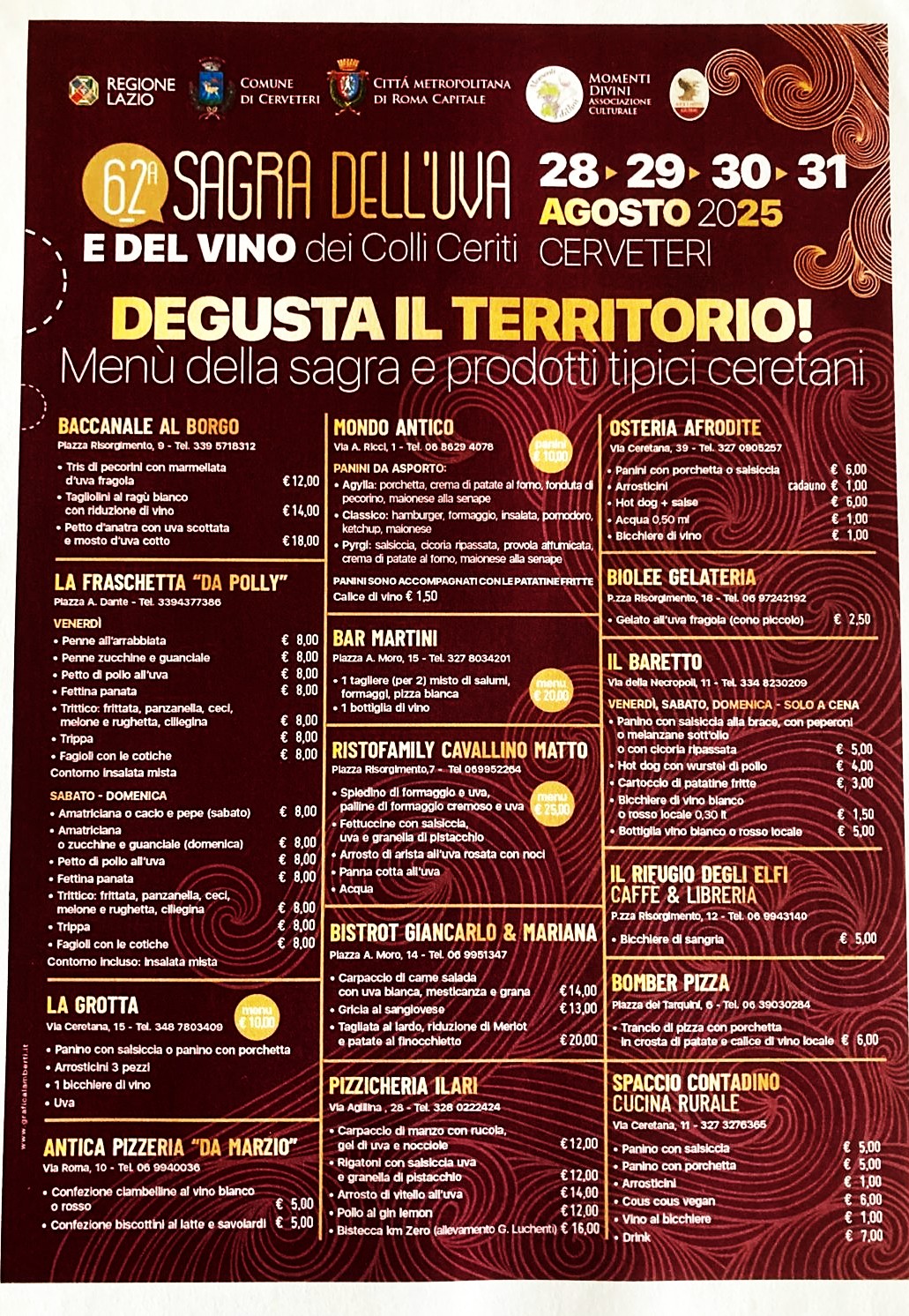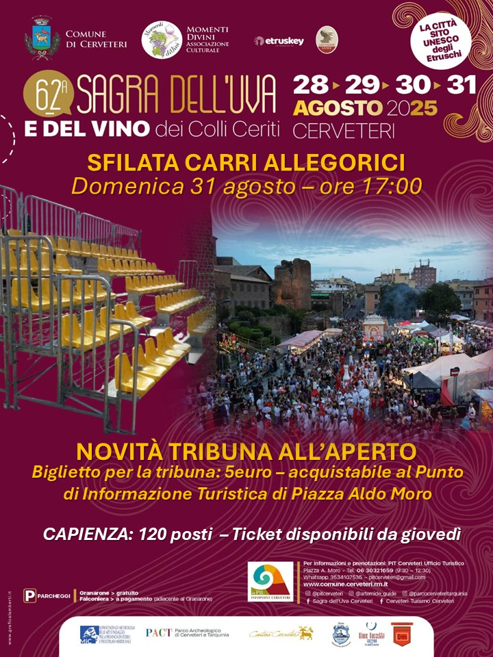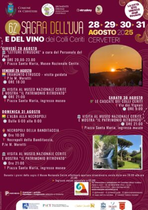 Cerveteri si prepara ad accogliere, dal 28 al 31 agosto, migliaia di visitatori per la storica “Sagra dell’Uva e del Vino dei Colli Ceriti”, giunta alla sua 62ª edizione. Un evento che non è solo celebrazione del vino, ma anche un tributo alla cultura, alla comunità e alla bellezza del territorio. Informazioni sulla sagra saranno visibili anche sullo “schermo parlante” della stazione Roma Termini, per promuovere Cerveteri e le sue eccellenze a un pubblico ancora più vasto.