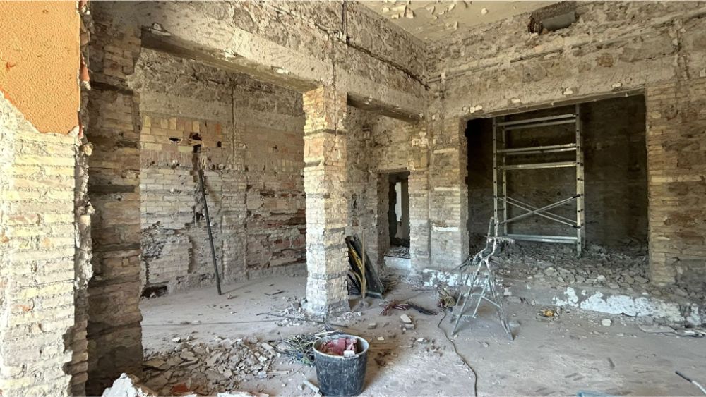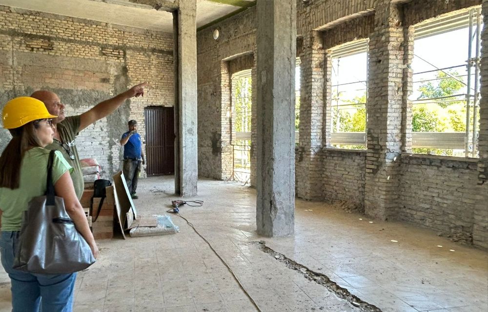 Poco dopo, la visita all’interno dell’edificio ha consentito di toccare con mano la trasformazione in corso: muri abbattuti, intonaci rimossi e interventi strutturali già in fase avanzata, tra cui il rinforzo dei pilastri portanti.