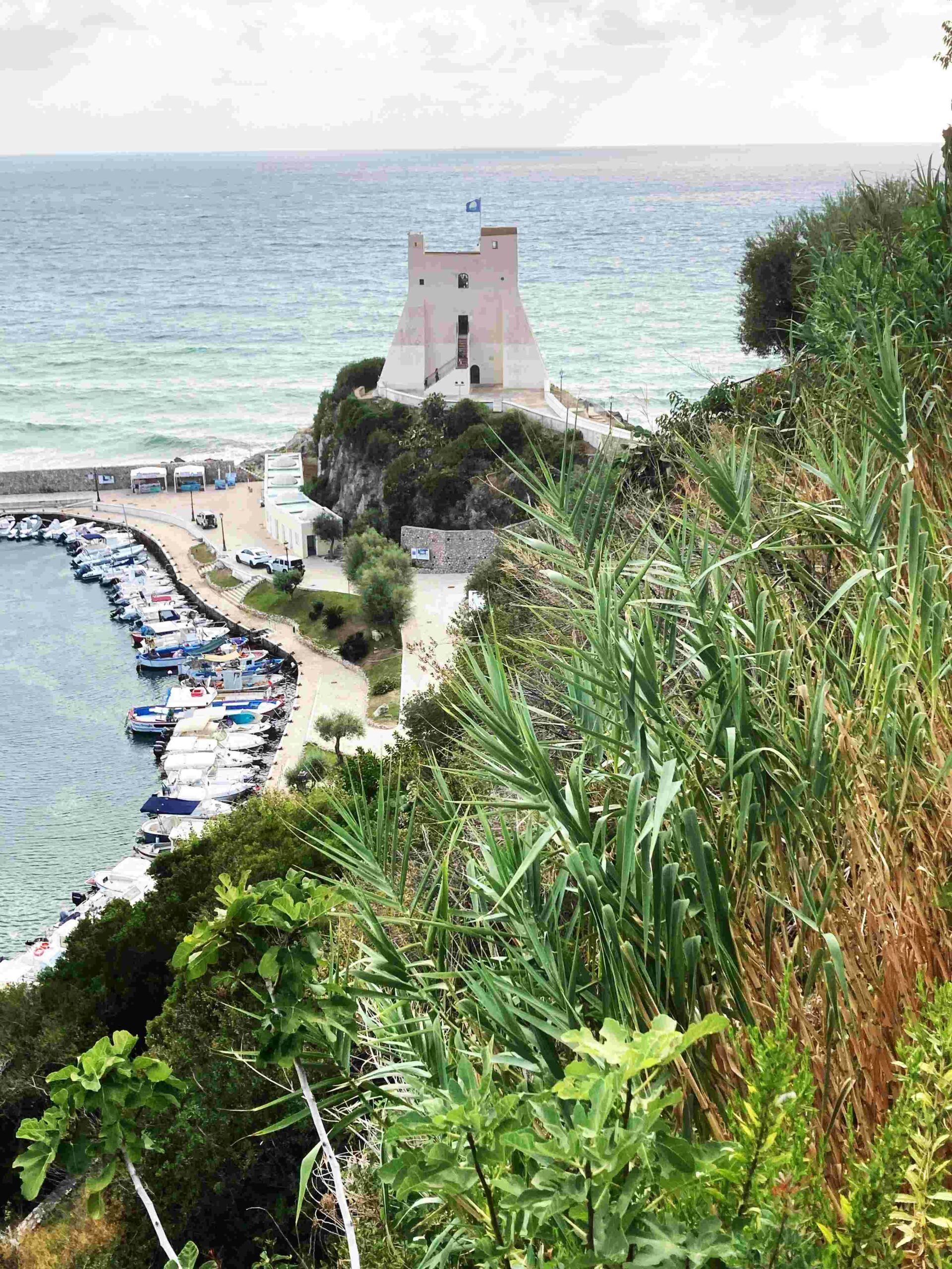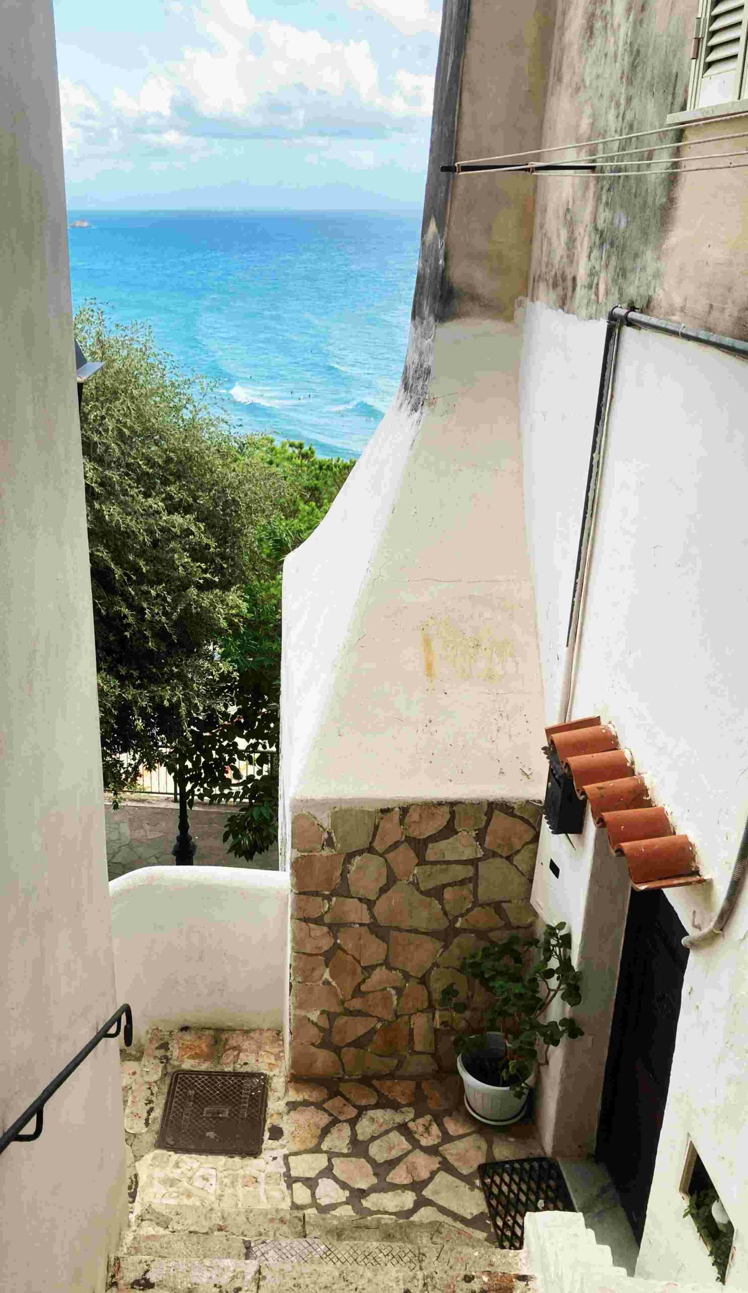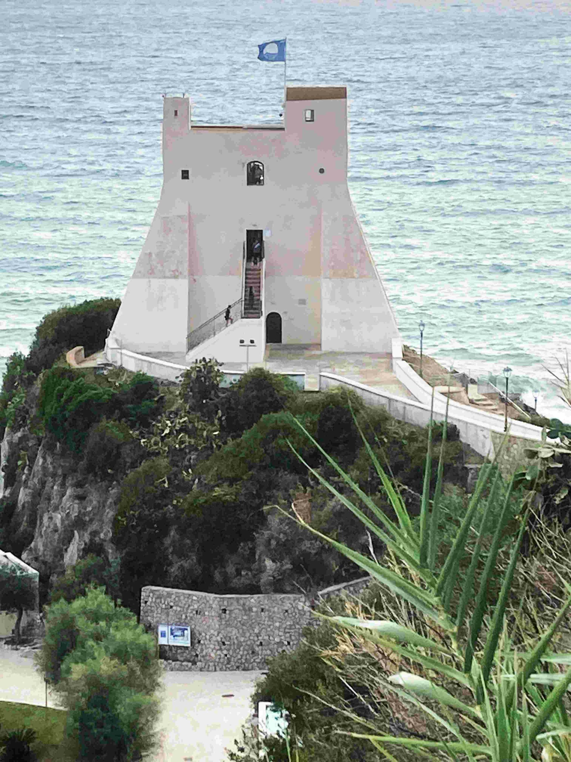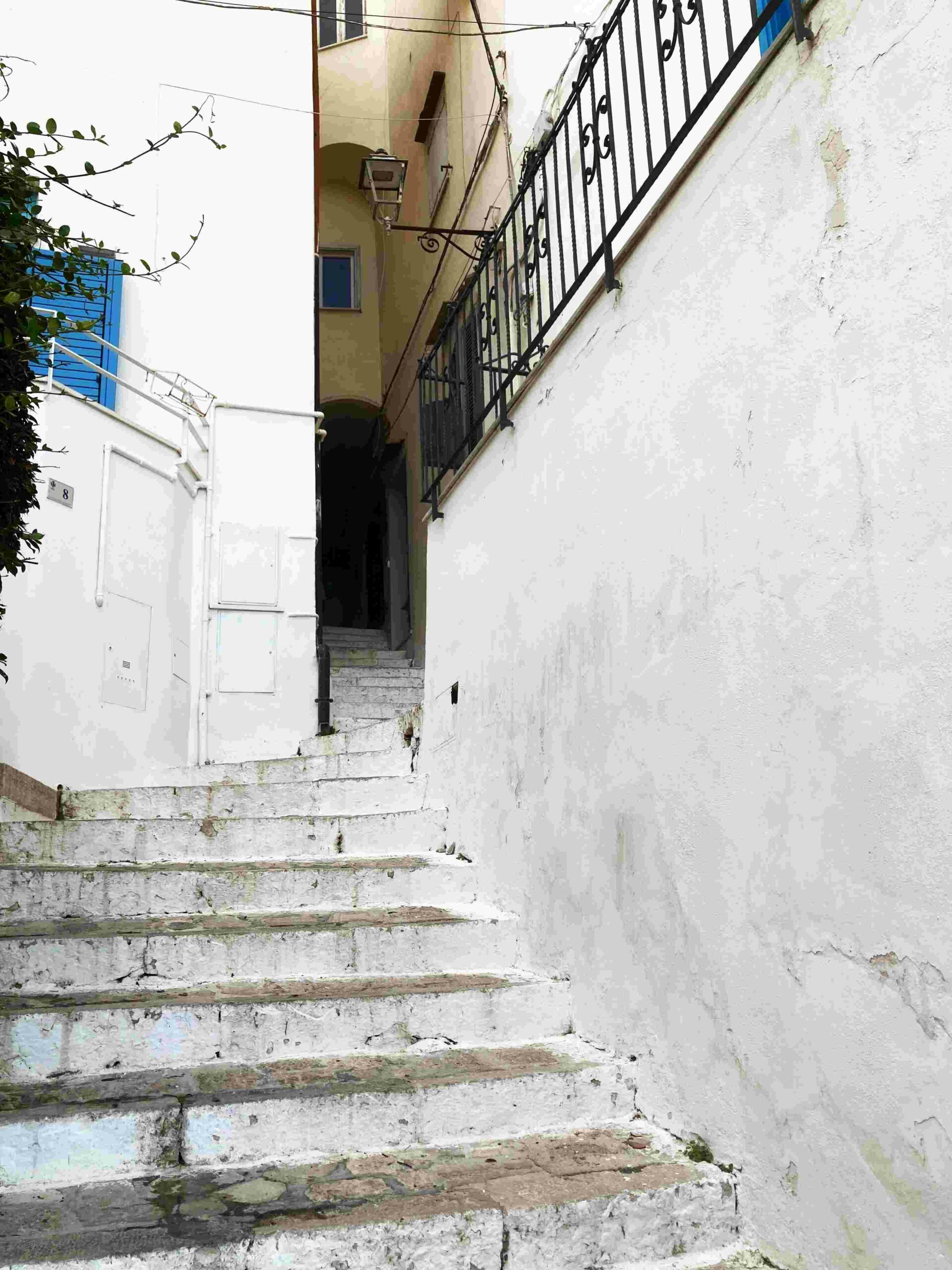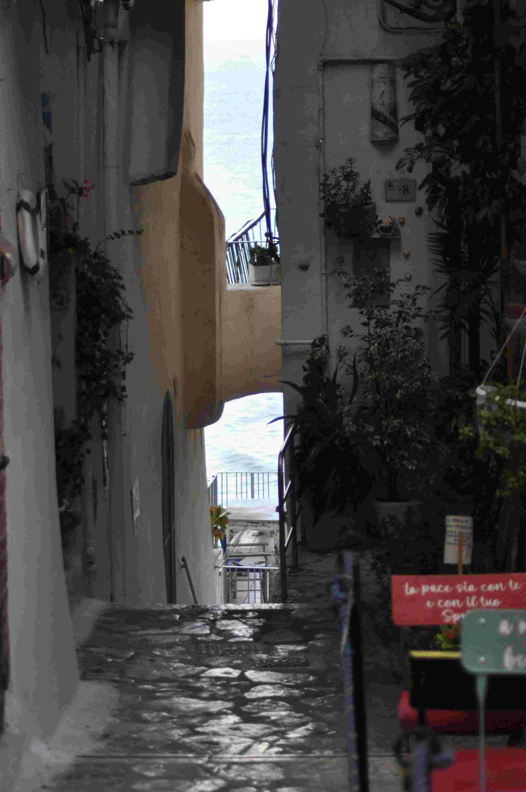 Le viuzze, strette e in discesa verso il mare, con gradini irregolari e antichi, si snodano tra case bianche e piazzette pittoresche. Ogni angolo è una scoperta, ogni scorcio una poesia. Mille dettagli, mille sfumature, conducono infine alla Torre Truglia, bianca e fiera, posta su uno scoglio all’estrema punta del promontorio, come sentinella del tempo.