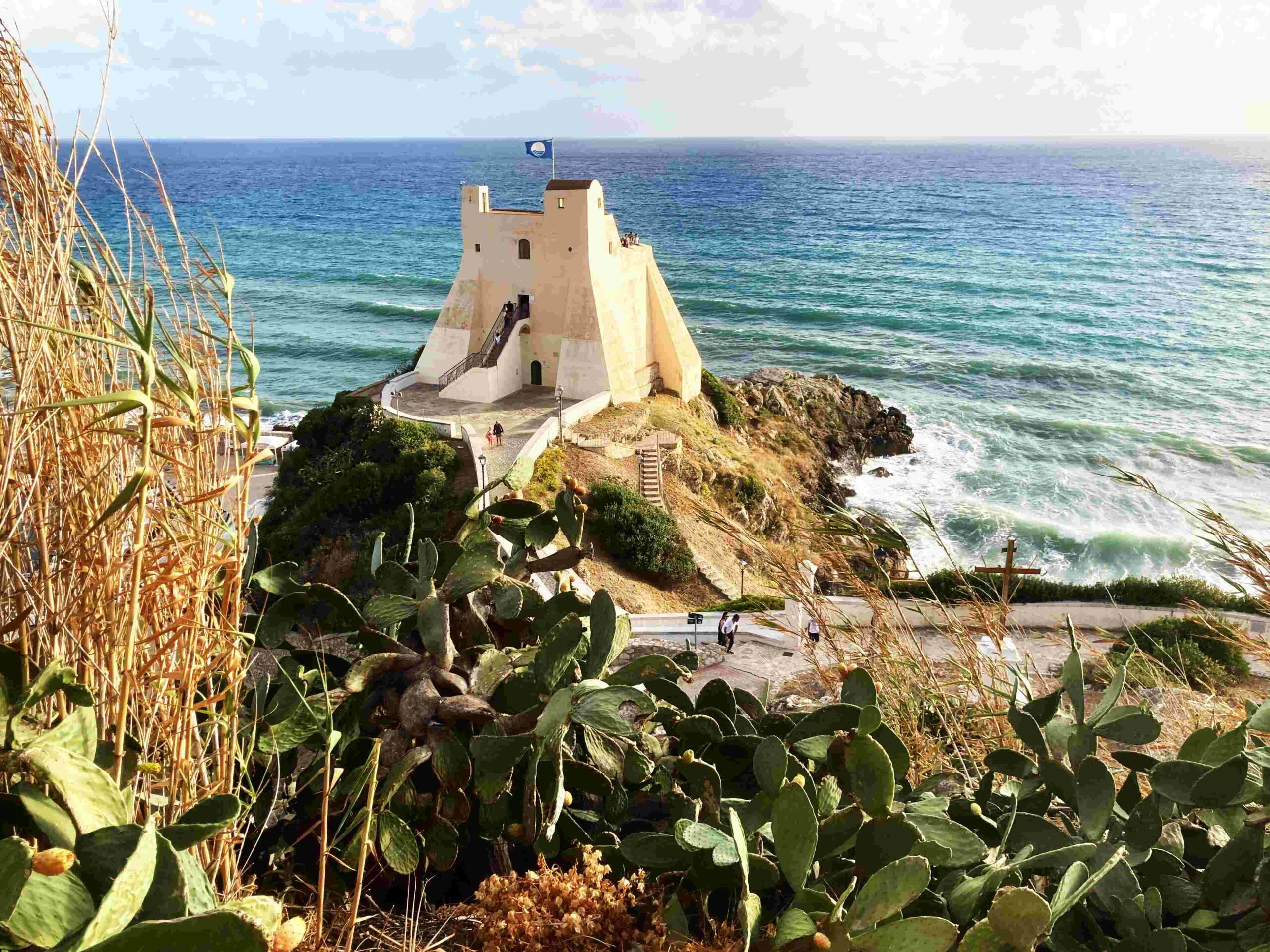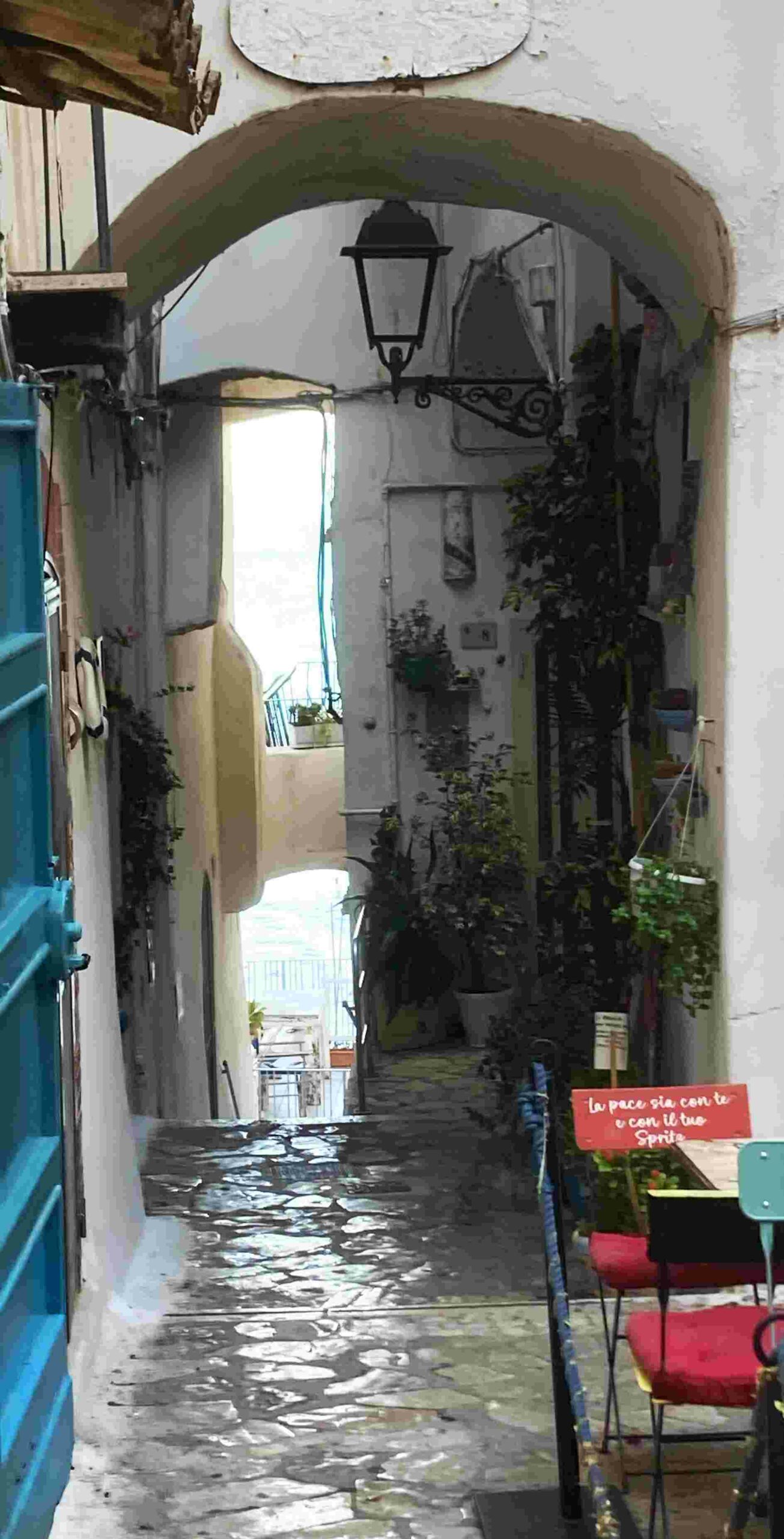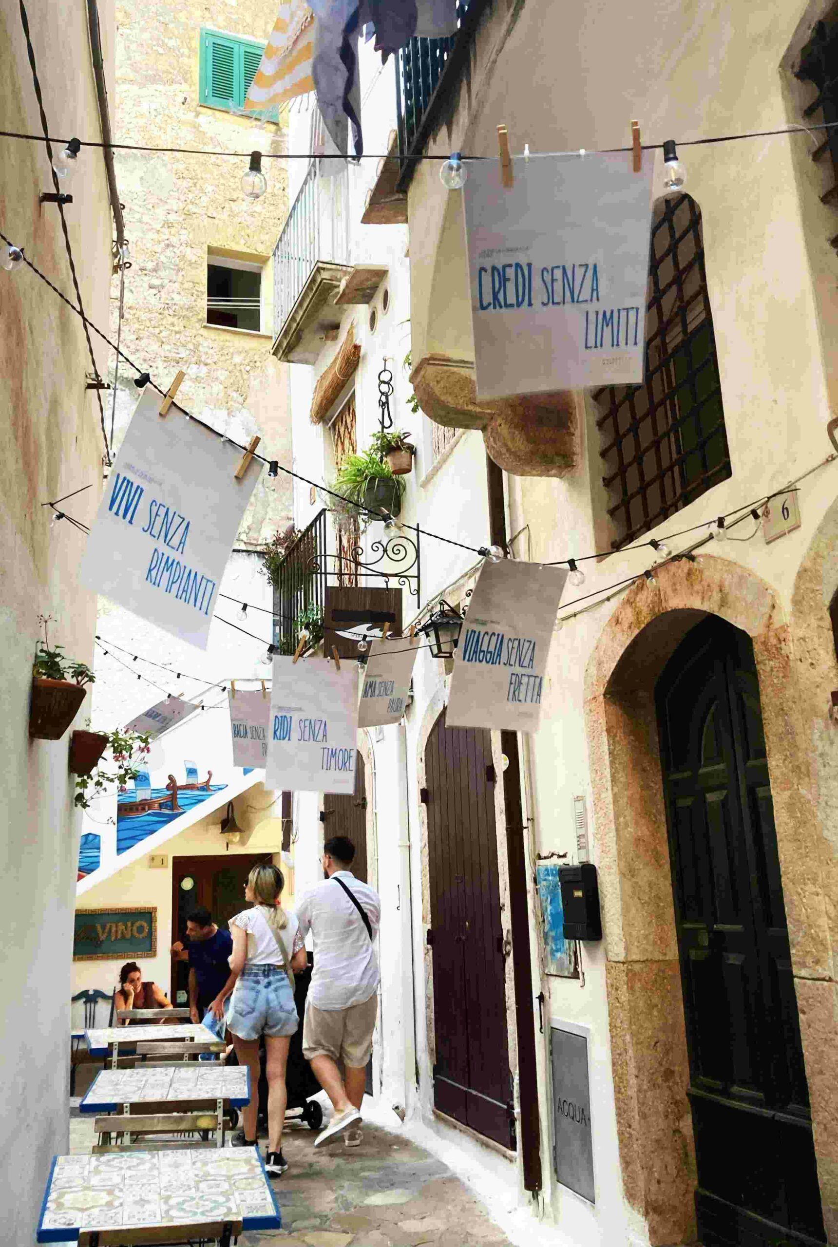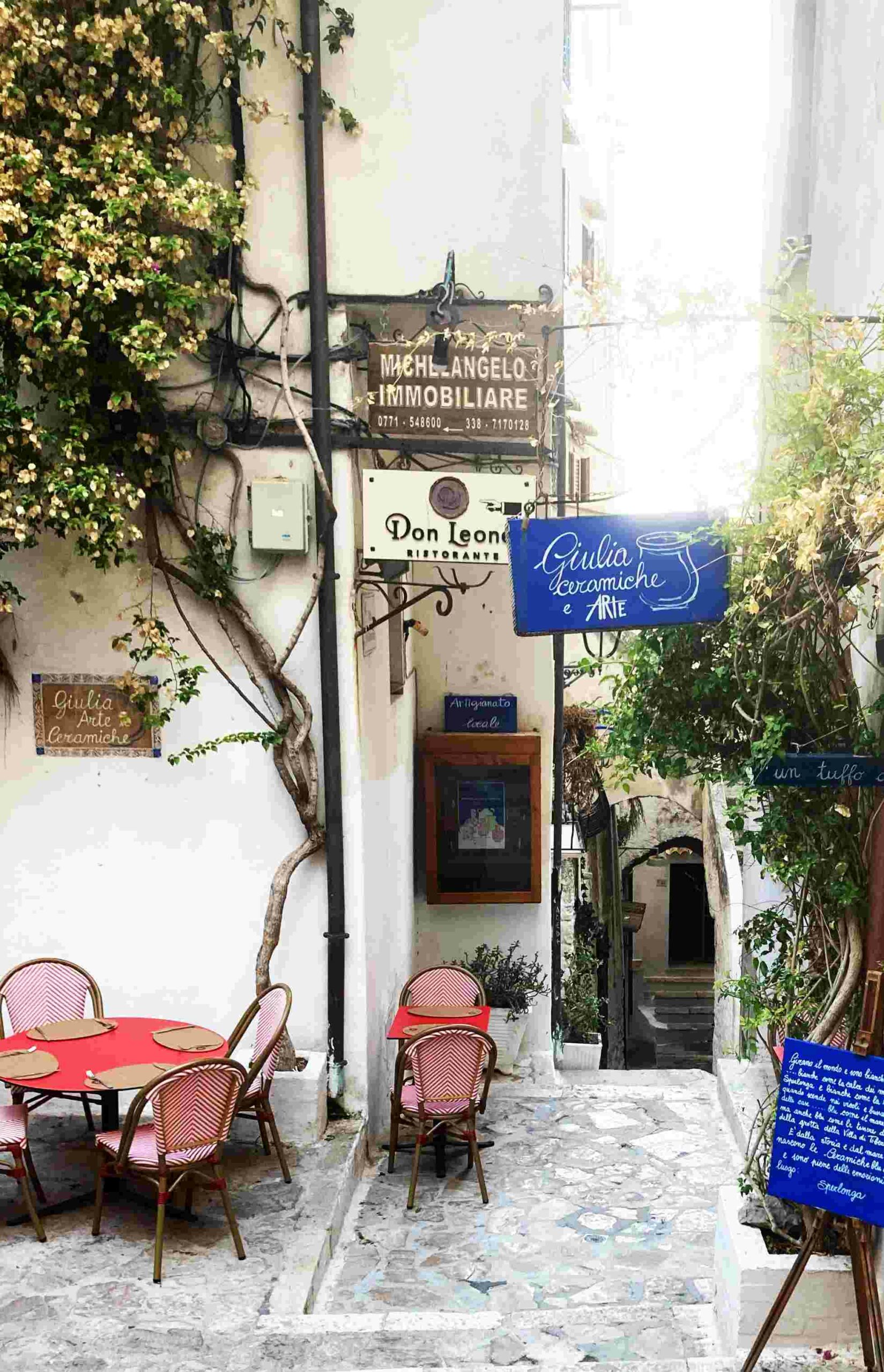 Le viuzze, strette e in discesa verso il mare, con gradini irregolari e antichi, si snodano tra case bianche e piazzette pittoresche. Ogni angolo è una scoperta, ogni scorcio una poesia. Mille dettagli, mille sfumature, conducono infine alla Torre Truglia, bianca e fiera, posta su uno scoglio all’estrema punta del promontorio, come sentinella del tempo.