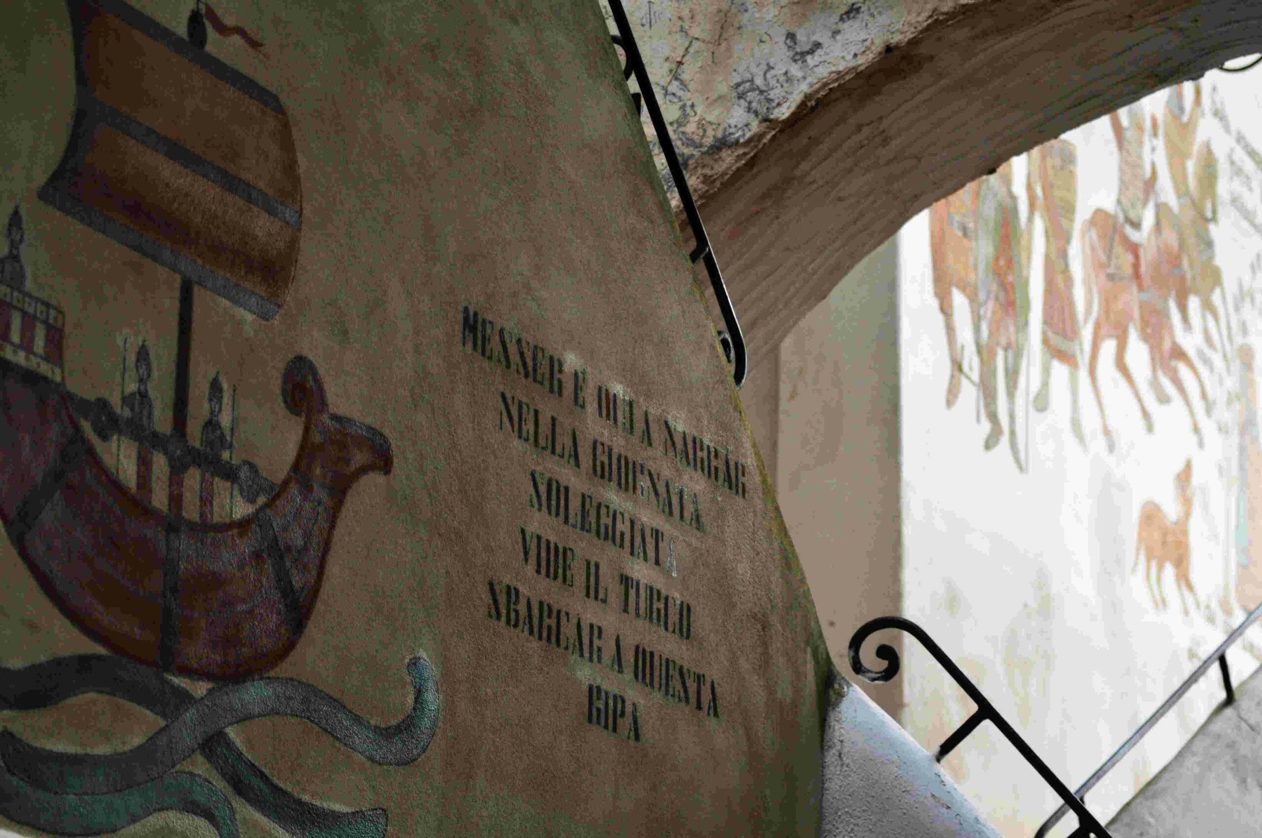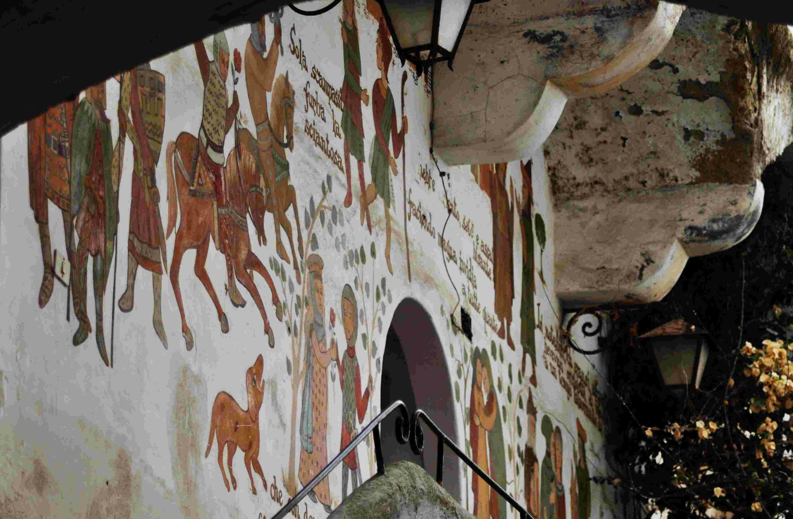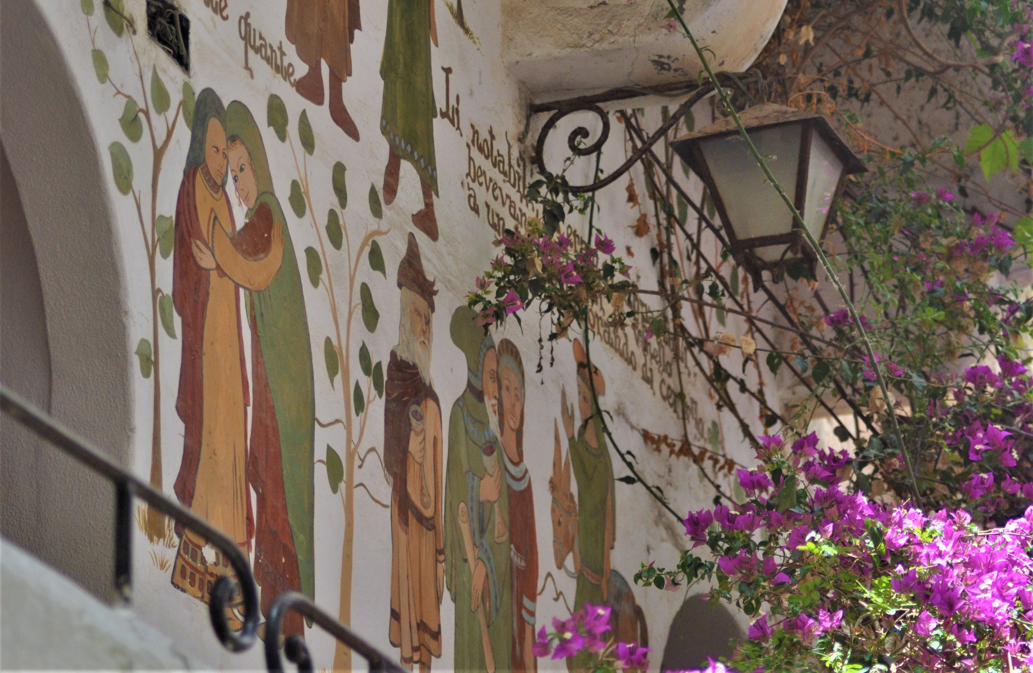 Un murale, in stile fumetto, con colori vivaci, in Via Porta Piccola della Chiesa, eseguito nel 1973, per finzione scenica, in occasione delle riprese del film “Mamma lì turchi”, poi completamente rifatto nei primi anni 2000, quando è stato ristrutturato il palazzo, ricorda la storia.