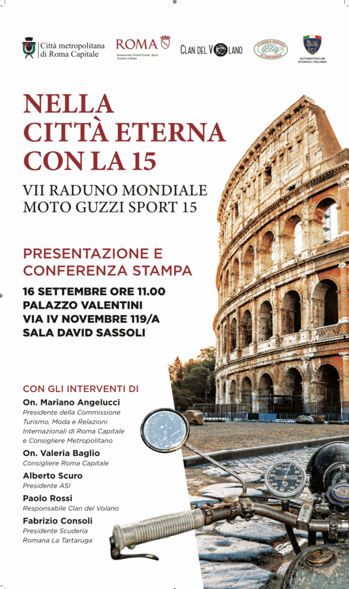 Martedì 16 settembre alle ore 11.00, a Palazzo Valentini – via IV Novembre 119/a (Sala David Sassoli) si terrà la Conferenza stampa di presentazione del VII Raduno Mondiale Moto Guzzi Sport 15.