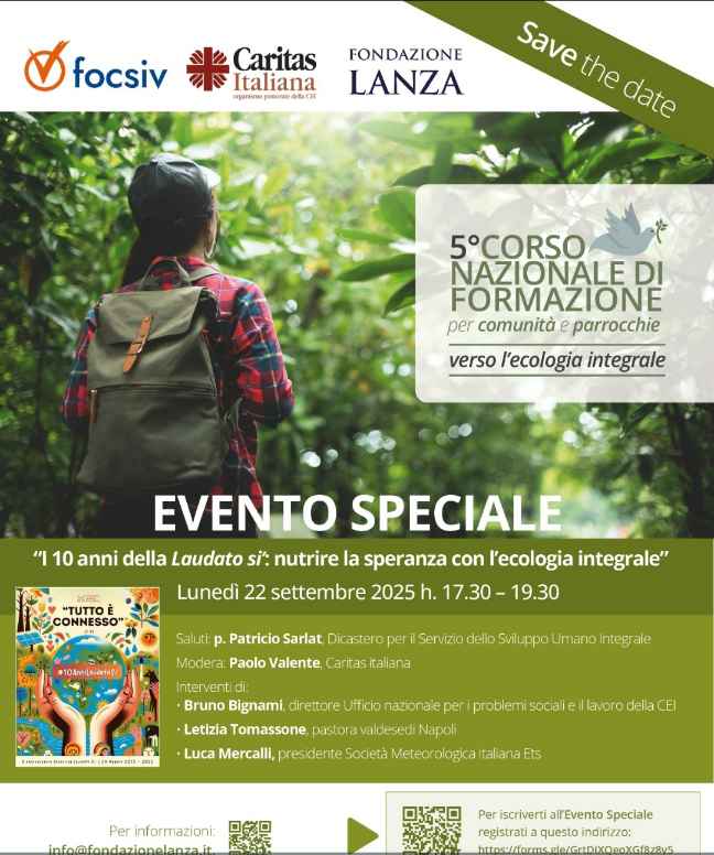 Il Corso, con l’impegno ad accompagnare l’ecologia integrale nelle diocesi e sui territori e a supportare pratiche e politiche per nutrire la speranza in un futuro sostenibile, è organizzato da Caritas italiana, Federazione degli organismi di volontariato internazionale di ispirazione cristiana (Focsiv) e Fondazione Lanza.