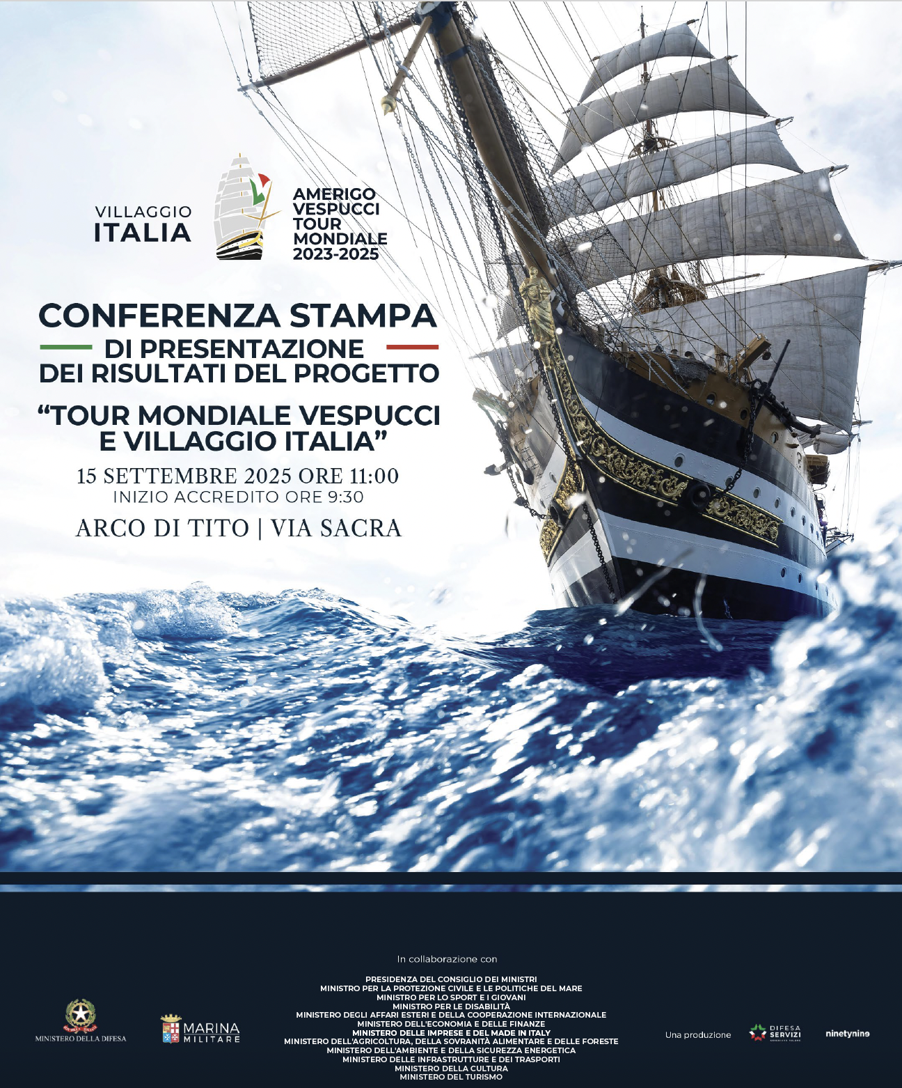 Roma, 15 settembre 2025 – Si è tenuta questa mattina a Roma, presso il Tempio di Venere all’interno del Parco Archeologico del Colosseo, la presentazione dei risultati complessivi e dell’analisi di impatto del progetto “Tour Mondiale di Nave Amerigo Vespucci – Villaggio Italia e Villaggio IN Italia 2023 – 2025” nato da un’idea del Ministro della Difesa Guido Crosetto, sostenuto dalla Difesa e da 12 Ministeri, oltre dalla Presidenza del Consiglio dei Ministri.