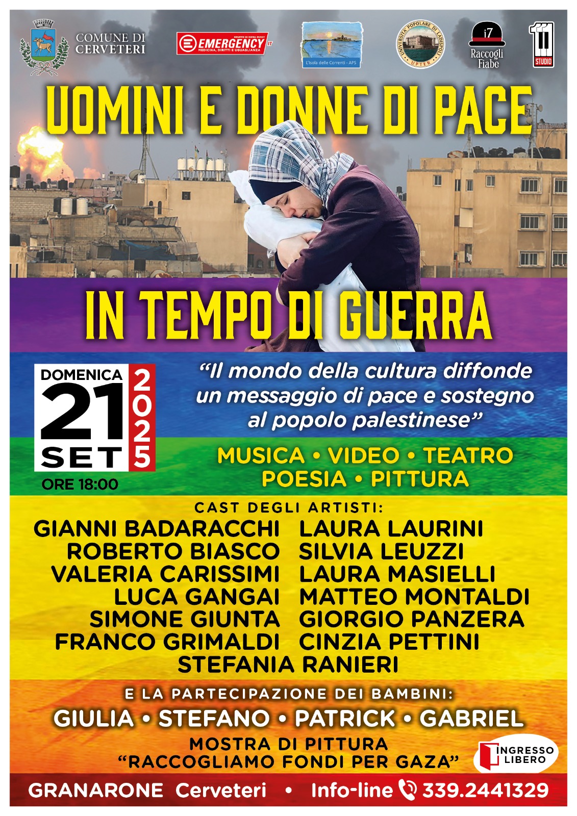 “Uomini e Donne di Pace in tempo di Guerra”: è il titolo dell’evento che unirà musica, proiezioni, teatro, poesia e pittura, in programma domenica 21 settembre alle ore 18:00 presso l’Aula Consiliare del Granarone a Cerveteri.