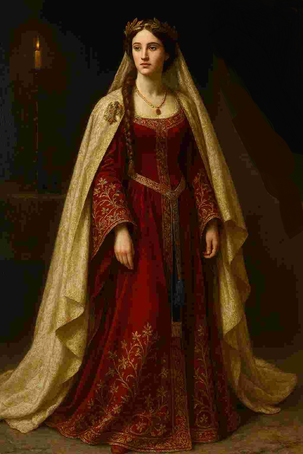 Sollevò poi con cura la tunica cremisi, ricamata a mano con fili d’oro che si intrecciavano in motivi floreali gotici: tralci di vite, melograni e rose si arrampicavano lungo l’orlo e le maniche, come se la natura stessa volesse abbracciarla e benedirla. Il velluto, tinto con il rosso carminio della cocciniglia e il blu profondo dei lapislazzuli macinati, donava alla stoffa una vibrazione cromatica quasi mistica, come se la luce vi danzasse dentro. Sfiorando le spalle candide, la indossò sopra la sottoveste. La tunica scivolò carezzandole il corpo fino a rasentare il pavimento, con la grazia di un sipario che si apre su una scena onirica.