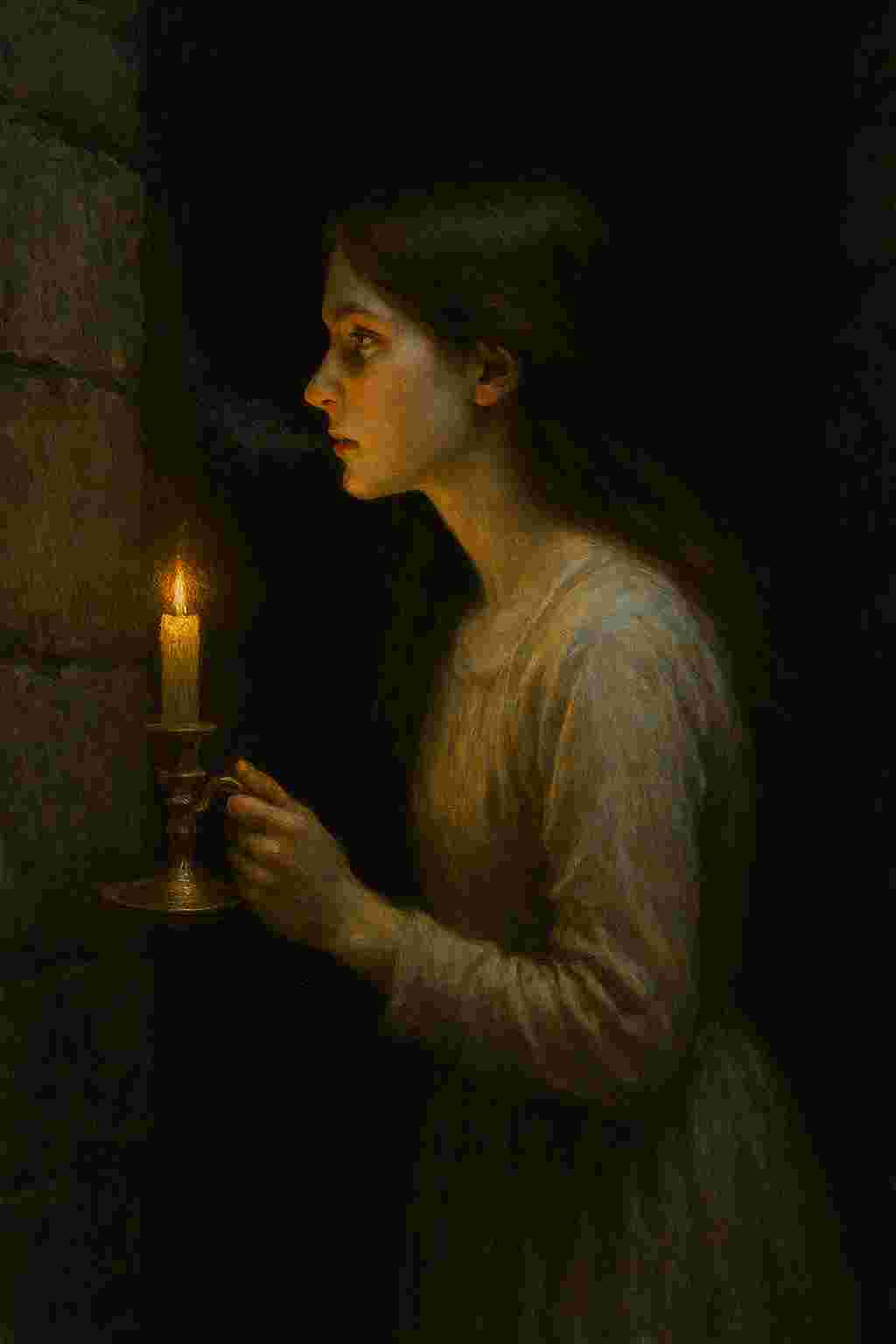 Entrò nel passaggio e al primo passo il muro si richiuse alle sue spalle con un sussurro secco, come pietra che trattiene il respiro. Bianca si fermò un istante, il candelabro con la candela tremolante in mano. Il passaggio era stretto, le pareti irregolari e il soffitto sembrava abbassarsi a ogni passo, come se il corridoio volesse piegarla al suo volere, come un servo che si inchina al padrone, costringerla a chinarsi. Il freddo ora le entrava nelle ossa, il respiro si condensava in nuvole sottili, il battito le rimbombava nelle orecchie come tamburi lontani.