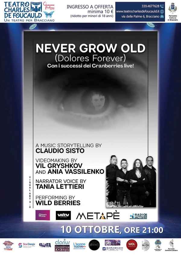 Venerdì 10 ottobre 2025 alle 21.00 “Never Grow old”, uno spettacolo musicale, sostanzialmente teatro-canzone come lo ha definito il suo autore Claudio Sisto, che attraverso la narrazione della vita e del percorso umano di Dolores O’Riordan voce ed anima dei Cranberries ci propone il vissuto irto di popolarità, ma anche di mille difficoltà dell’artista.
