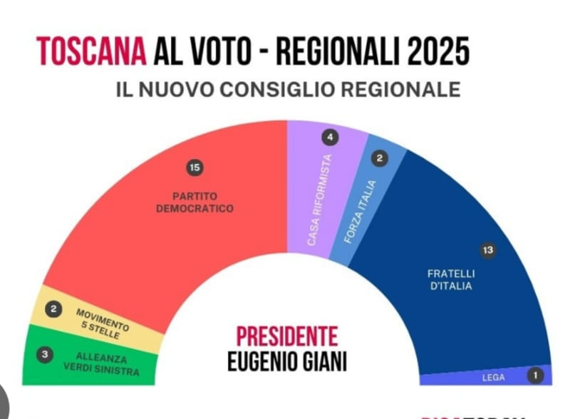 Sul fronte del centrodestra, Fratelli d’Italia, con il 26,78%, si conferma di gran lunga il primo partito, lasciando a Forza Italia il 6,17% e alla Lega un modesto 4,38% che, rispetto al 21,78% delle regionali del 2020, evidenzia l’effetto destabilizzante della presenza, su tutto il territorio regionale, del generale Vannacci.
