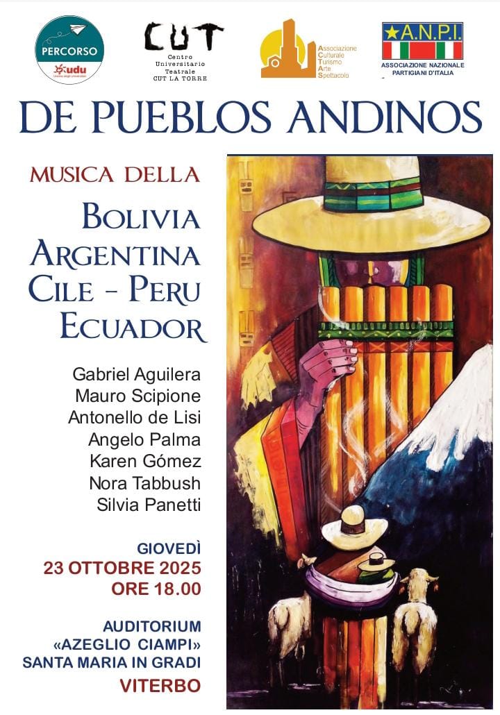 Il Comitato provinciale dell’ANPI di Viterbo, le sue strutture territoriali, l’Associazione Universitaria Percorso, il Centro Universitario teatrale-CUT La Torre e l’Associazione Cultura Turismo Arte Spettacolo invitano a partecipare al concerto che sarà un’occasione preziosa per immergersi nella musica che attraversa le Ande, il tempo e la storia, facendosi portatrice di temi universali come identità, libertà, resistenza, democrazia, memoria, speranza e pace.