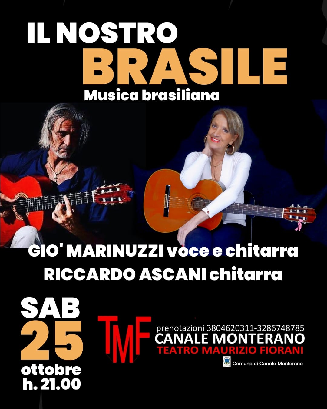 Grande musica brasiliana, Sabato 25 ottobre 2025, ore 21.00, nel Foyer del teatro di Canale Monterano; suoneranno due bravissimi musicisti: GIO’ MARINUZZI nome storico della musica brasiliana in Italia, e RICCARDO ASCANI chitarrista e compositore di flamenco contemporaneo