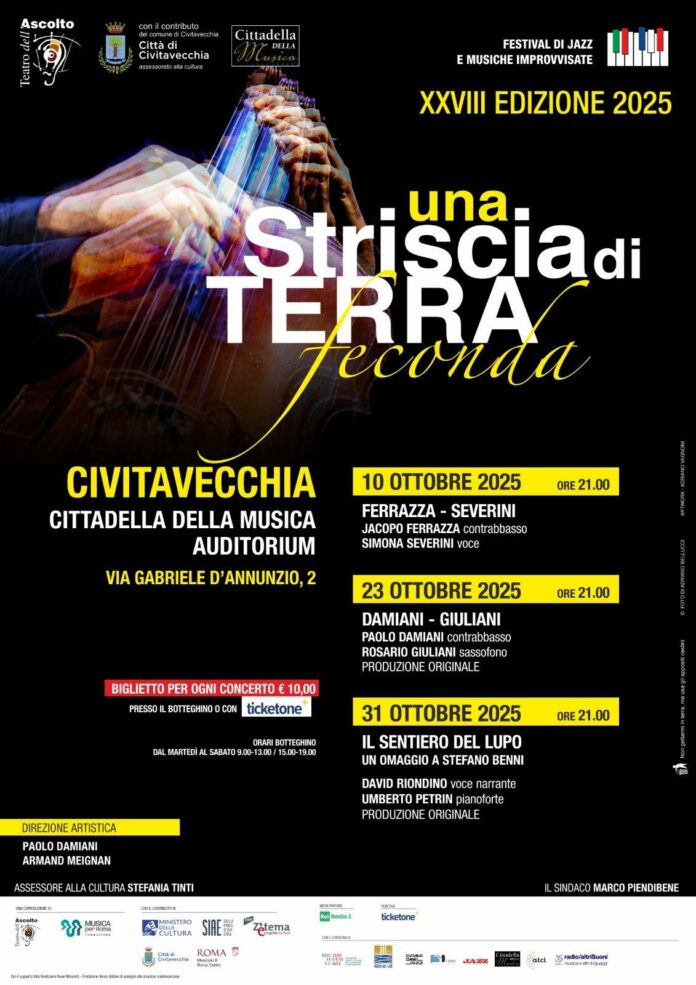 Civitavecchia, 22 ottobre 2025 – Prosegue la stagione culturale del Comune di Civitavecchia sostenuta dal Bando Cultura, Musica e Teatro con due appuntamenti distinti: la rassegna di jazz e musiche improvvisate “Una Striscia di Terra Feconda”, già avviata il 10 ottobre alla Cittadella della Musica e in calendario fino al 31 ottobre, e il festival di narrazione sportiva “Zona Mista”, in programma dal 24 al 26 ottobre tra Re-Cycle Officine e GranariOff.