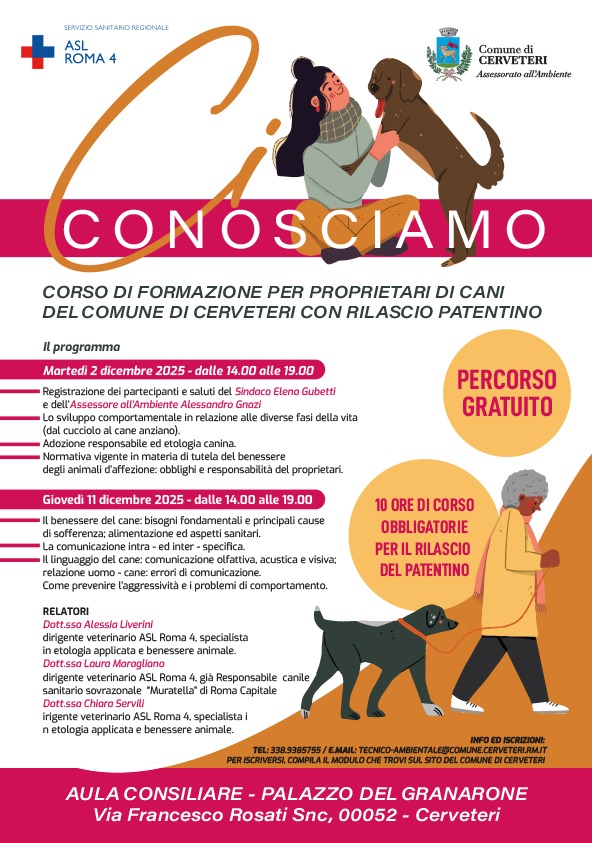 “A livello nazionale non esiste una normativa specifica e benché meno a livello locale – aggiunge l’Assessore Gnazi – non potremo essere certamente noi a legiferare in materia. Ma possiamo però porre in essere quelle iniziative necessarie affinché nei possessori di cani cresca oltre che la competenza, la consapevolezza di quanto un cane, se non gestito, trattato e accompagnato in maniera corretta, possa avere reazioni inconsulte e anche pericolose. Relatori del corso, che si svolgerà in due giornate all’interno dell’Aula Consiliare del Granarone, la Dottoressa Alessia Liverini, Dirigente Veterinario della Asl Roma 4 e specialista in etologia applicata e benessere animale, la Dottoressa Laura Maragliano, Dirigente veterinario della Asl Roma 4, già responsabile del canile sanitario sovrazonale “Muratella” di Roma Capitale, e la Dottoressa Chiara Servili, anch’essa Dirigente Asl”.