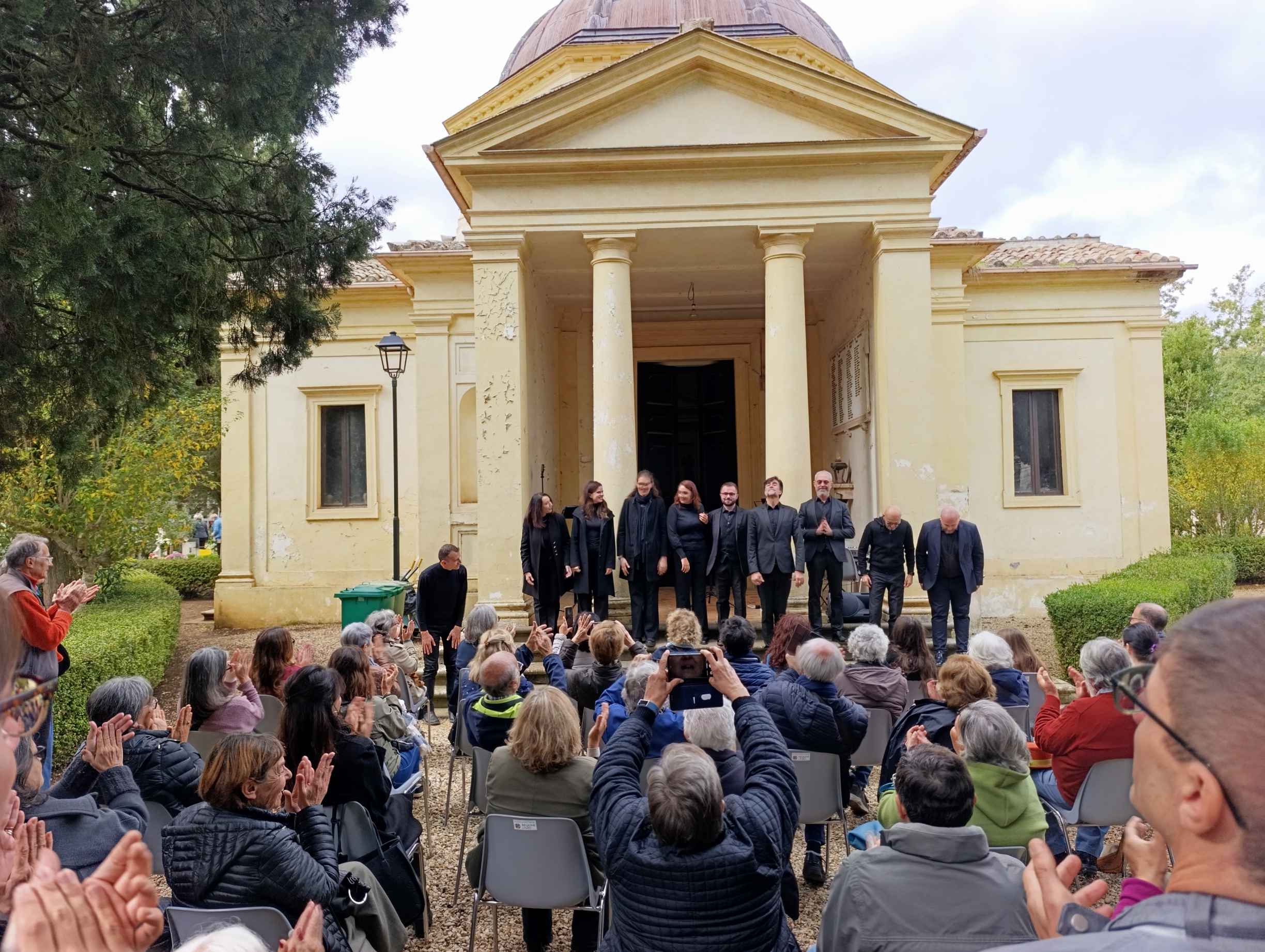 Nel cuore del camposanto, tra le colonne della cappella neorinascimentale, Labirinto Vocale, accompagnato al pianoforte da Diego Procoli e diretto da Giuliano Mazzini, ha rotto quel muro di separazione tra la morte e la vita riunendo le anime dei presenti e dei trapassati in un limbo di bellezza, quella che solo la musica e l’arte sanno creare.
