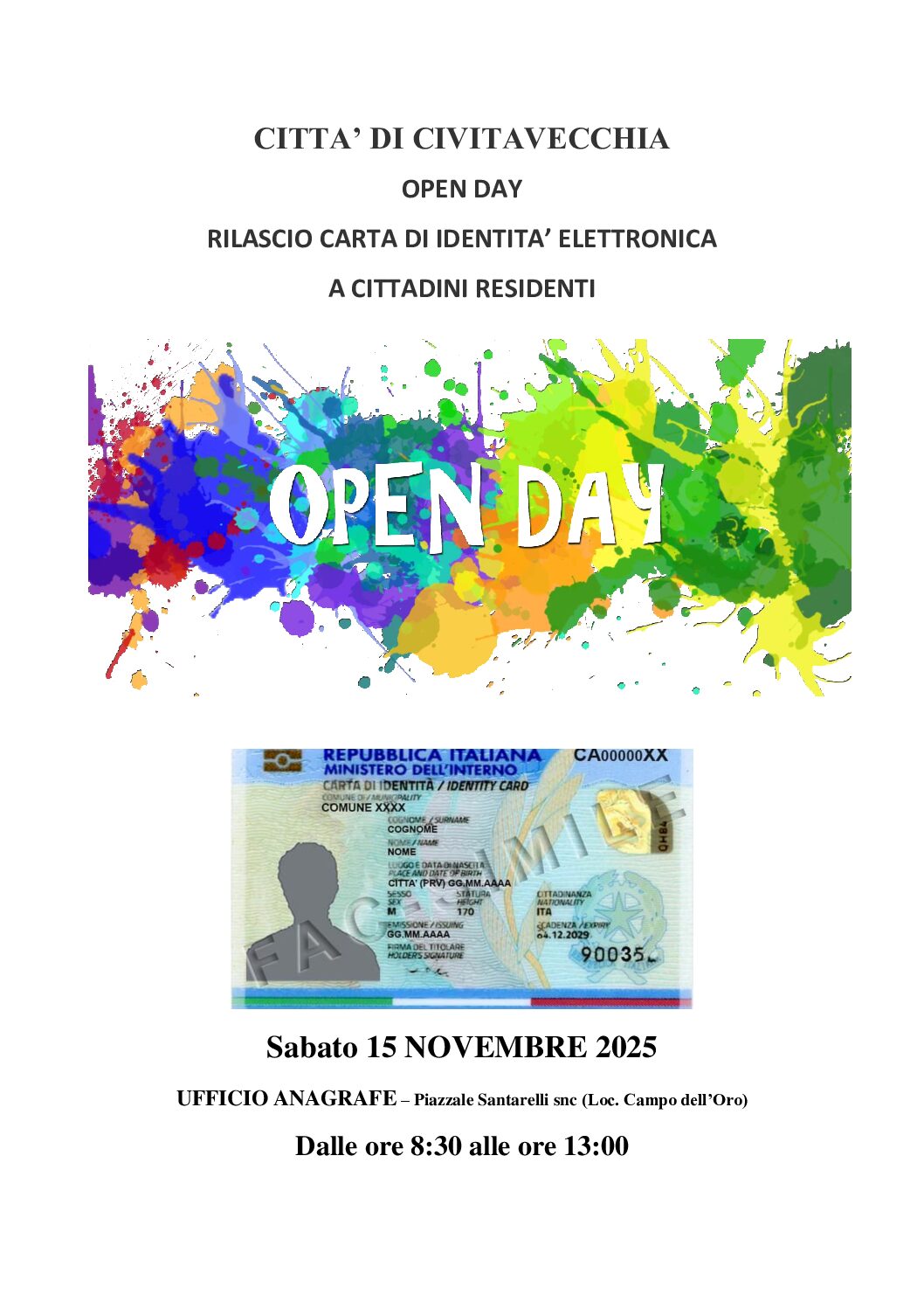 Si comunica l’apertura straordinaria dell’Ufficio Anagrafe del Comune di Civitavecchia sabato  15 NOVEMBRE 2025. Il secondo open day di quest’anno dedicato alla Carta di Identità Elettronica, dato atto che, a partire dal 3 agosto 2026, per le carte di identità cartacee cesserà la validità sia in Italia che all’estero, qualunque sia la loro scadenza, in attuazione del Regolamento UE che stabilisce requisiti di sicurezza uniformi per tutti i documenti di identità rilasciati dagli Stati membri dell’Unione Europea.