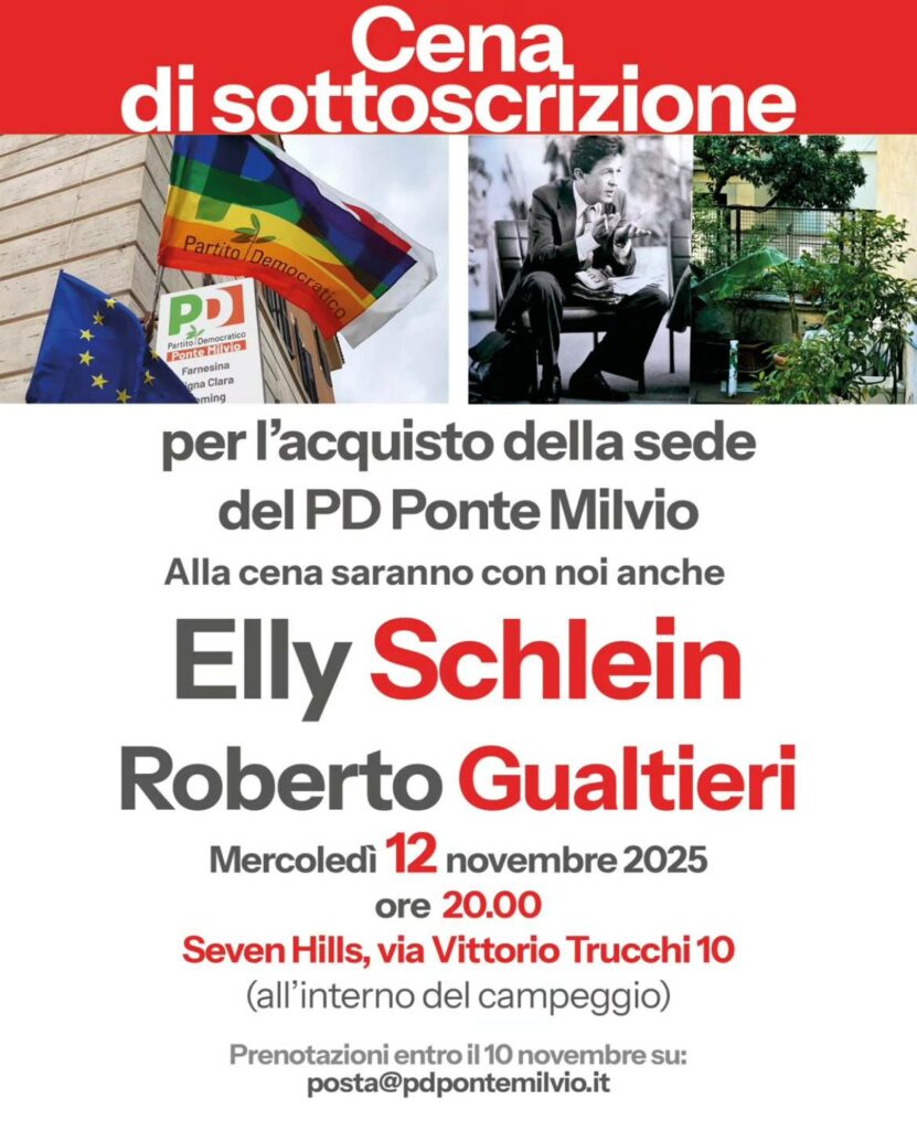 Mercoledì 12 novembre, alle ore 20, si terrà una cena di sottoscrizione, promossa dal Partito Democratico di Ponte Milvio per sostenere la campagna di raccolta fondi destinata all’acquisto della sede storica della sezione: un luogo della politica con una lunga tradizione, radicato nel tessuto del quartiere e tuttora punto di riferimento per militanti, simpatizzanti e cittadini di Roma Nord.
