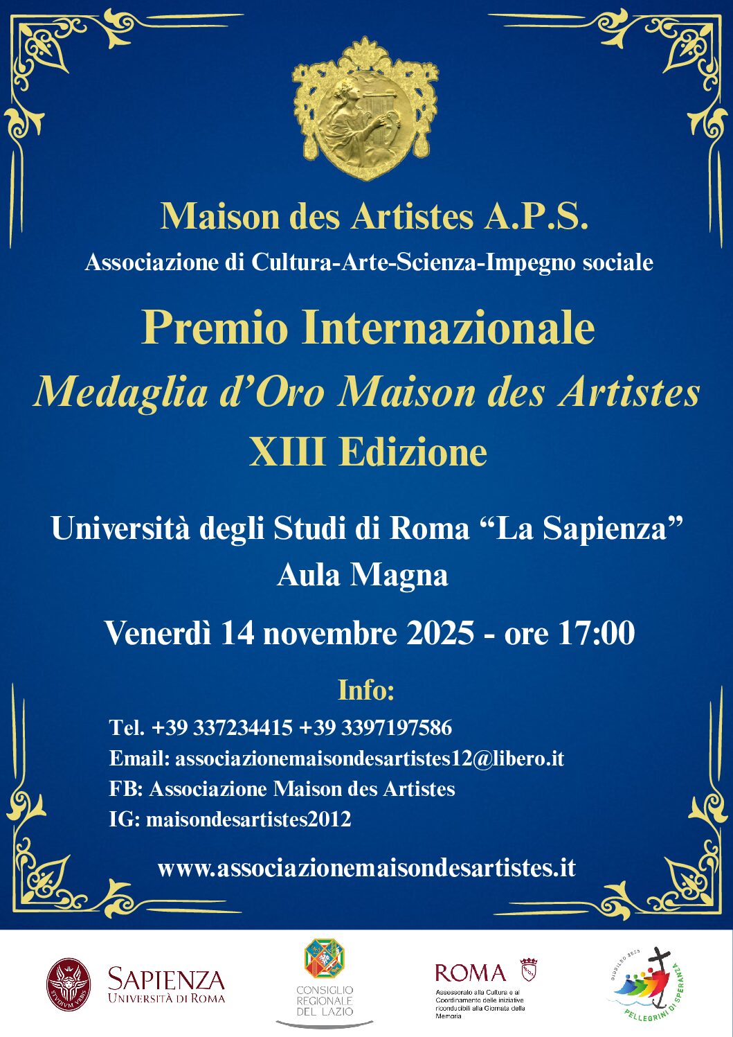 Venerdì 14 novembre, nell’Aula Magna dell’Università degli Studi di Roma “La Sapienza”, alle ore 17.00, ha luogo la XIII Edizione del Premio Internazionale Medaglia d’Oro Maison des Artistes.