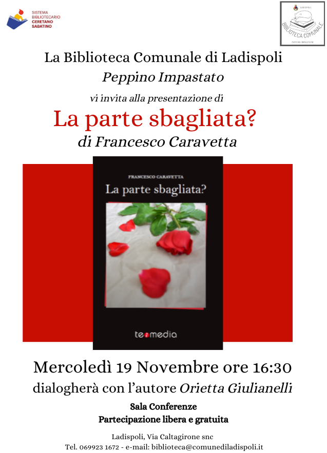 L’amministrazione comunale informa che mercoledì 19 novembre alle 16:30, in Biblioteca si svolgerà la presentazione del libro “La parte sbagliata?” di Francesco Caravetta. Il romanzo si svolge in un piccolo paese della Calabria e racconta fatti realmente accaduti a persone realmente esistite: è la storia di Antonia Vitelli, una donna che tra la fine del ‘700 e i primi dell’800 subisce anni di violenza domestica da parte del marito. Antonia prova a rifarsi una vita con tantissimi ostacoli e colpi di scena, mentre le difficoltà legate al periodo storico attraversato dal Regno di Napoli si intrecciano con la sete di vendetta del marito che la tormenterà per tutta la vita. L’accurata ricerca sociologica e l’invenzione narrativa danno vita ad un romanzo costruito con efficace semplicità, dove gli elementi importanti del racconto ci sono tutti (l’eroe coraggioso e fedele, l’amore contrastato, la guerra lunga e sanguinosa, l’antieroe feroce e senza scrupoli) e i grandi temi della vita vengono attraversati e riattraversati (nascita, morte, vendetta, tradimento…). L’autore interroga il passato investendo i suoi umili personaggi del compito di narrarci una condizione senza tempo: quella di chi, in qualunque caso, si trova dalla parte sbagliata. Il libro è stato insignito del premio “Gaetano Cingari” , “Premio Firenze” e del Premio Artistico-letterario Internazionale “Antonio Proviero – città di Trenta”, nelle cui motivazioni emerge la capacità dell’autore di scrivere un romanzo appassionante e coinvolgente, contestualizzando perfettamente le vicende trattate con le condizioni storiche del nostro paese.