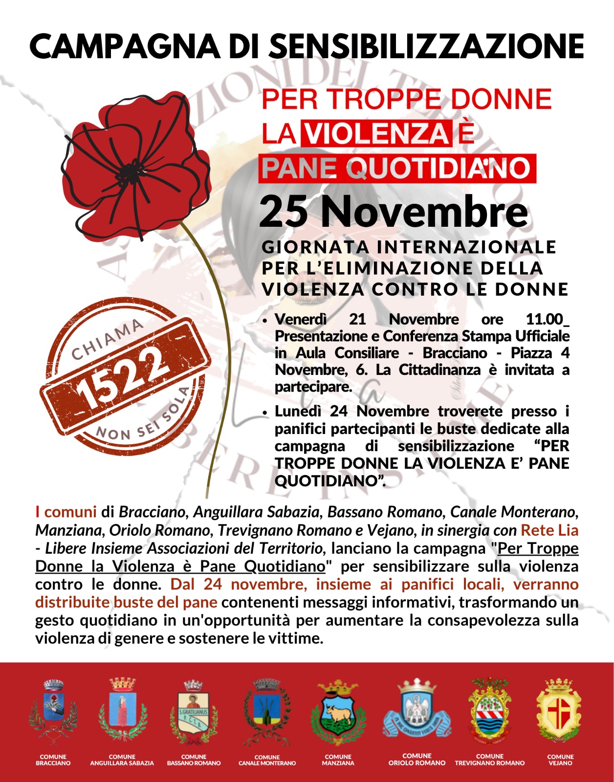 In occasione della Giornata Internazionale per l’Eliminazione della Violenza contro le Donne, i Comuni del territorio – insieme alla Rete Lia e alle associazioni locali – lanciano la campagna “Per troppe donne la violenza è pane quotidiano”.