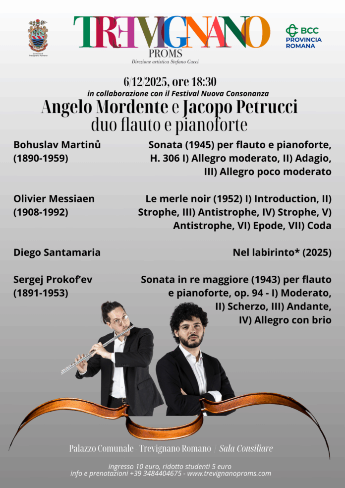 Musiche di Martini, Messiaen,Prokofiev, Santamaria con un programma che riunisce tre lavori cameristici del Novecento, tutti composti a ridosso della Seconda guerra mondiale e ciascuno testimone di un linguaggio musicale peculiare. Composta da Bohuslav Martinů durante il soggiorno statunitense, la Sonata H. 306 costituisce un brano di riferimento del repertorio flautistico del Novecento.