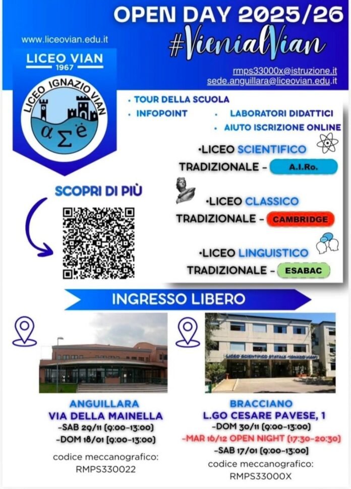 La Dirigente Scolastica Lucia Lolli del Liceo Scientifico Statale “Ignazio Vian” della sede centrale di Bracciano e della sede staccata di Anguillara, insieme allo Staff della vicepresidenza, tutto il team di docenti, docenti per l’inclusione, personale ATA e le studentesse e studenti impegnati nelle attività di orientamento, sarà felice di accogliere le alunne e gli alunni e le loro famiglie delle scuole secondarie di primo grado del territorio che vorranno venire a visitare le nostre sedi nei giorni indicati nella locandina. Le nostre sedi ascolteranno i vostri bisogni e risponderanno alle vostre domande.