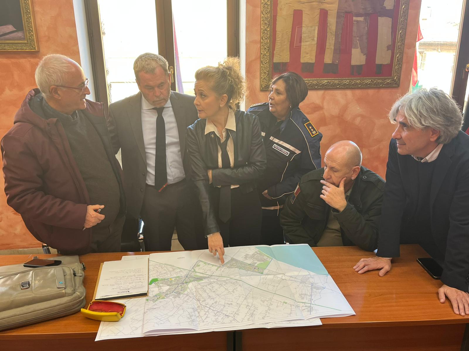 In Sala Giunta, il Sindaco Elena Gubetti, il Vicesindaco Riccardo Ferri, la Comandante di Polizia Locale Cinzia Luchetti e il Delegato al Piano Urbano del Traffico Pier Lucio Latini incontrano gli ingegneri redattori del piano