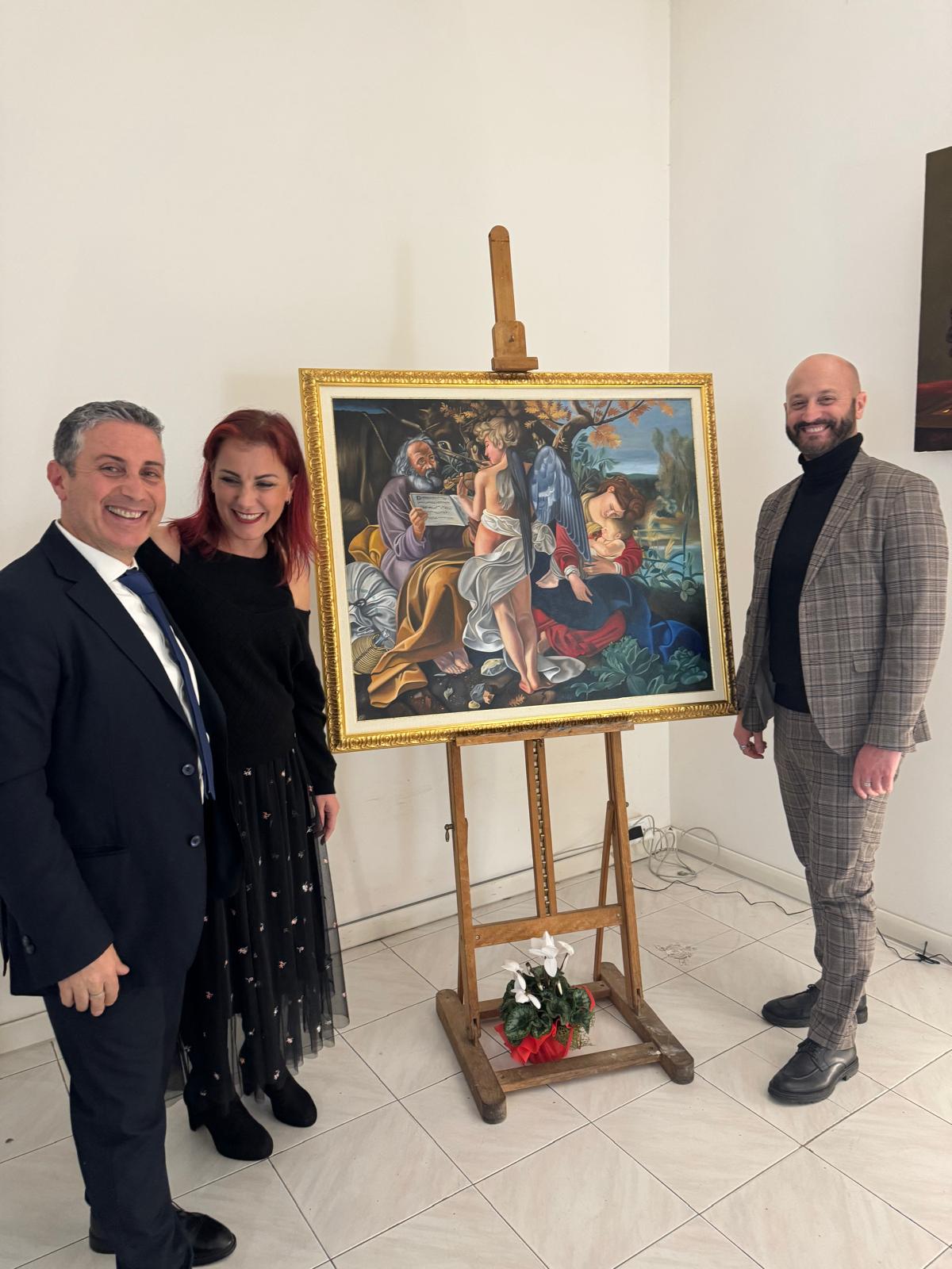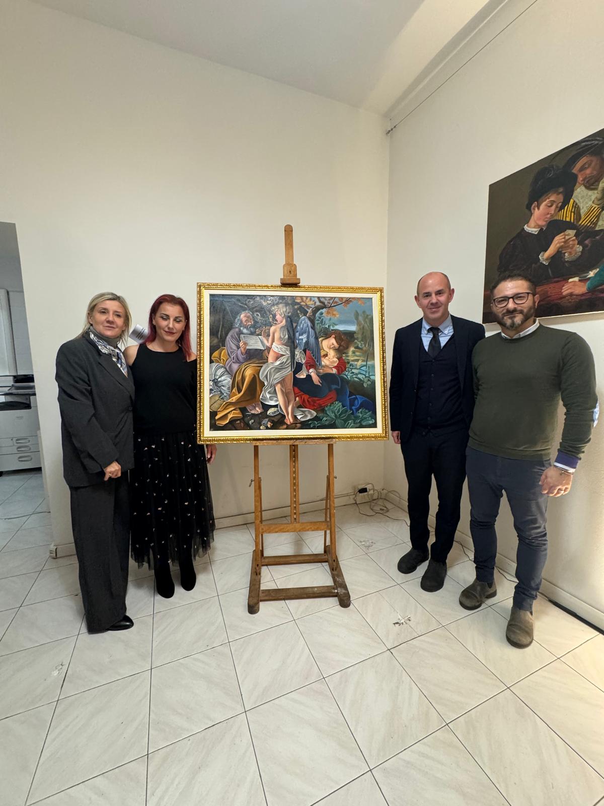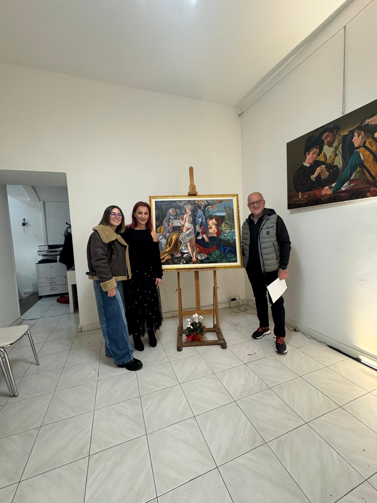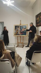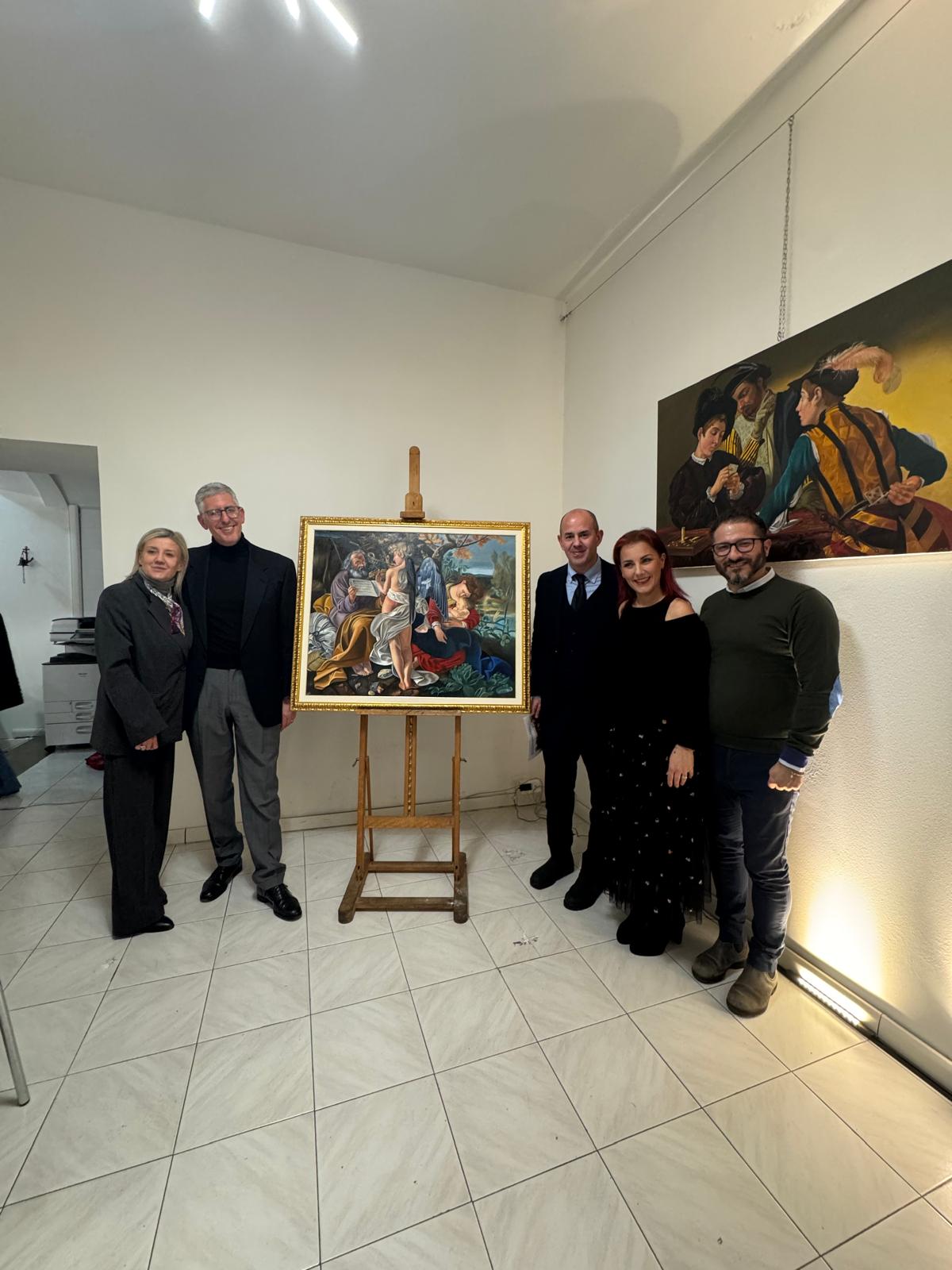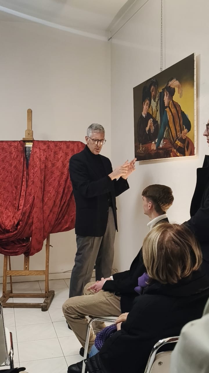 Nel corso dell’incontro, Valerio Vernesi ha sviluppato un’analisi approfondita del Riposo durante la fuga in Egitto di Caravaggio, soffermandosi sulla composizione, sull’uso della luce e sulla profonda umanità dei personaggi, elementi che rendono l’opera uno dei capolavori giovanili del maestro. Accanto a questo lavoro erano presenti altre tre repliche realizzate da Silvia Moccia, ispirate a celebri dipinti caravaggeschi: I bari, incentrato sul tema dell’inganno e della finzione; Amor Vincit Omnia, che indaga il rapporto tra umano e divino; e La cattura di Cristo, scena di forte intensità drammatica legata ai momenti della Passione. Nel corso della spiegazione, Vernesi ha sottolineato come la replica rappresenti un lavoro di studio e interpretazione, capace di restituire il linguaggio pittorico originale attraverso rigore tecnico e sensibilità artistica. L’intervento, chiaro e accessibile, ha mantenuto alta l’attenzione dei presenti, che hanno seguito con interesse l’analisi, soffermandosi sui dettagli pittorici e simbolici messi in evidenza dallo storico.