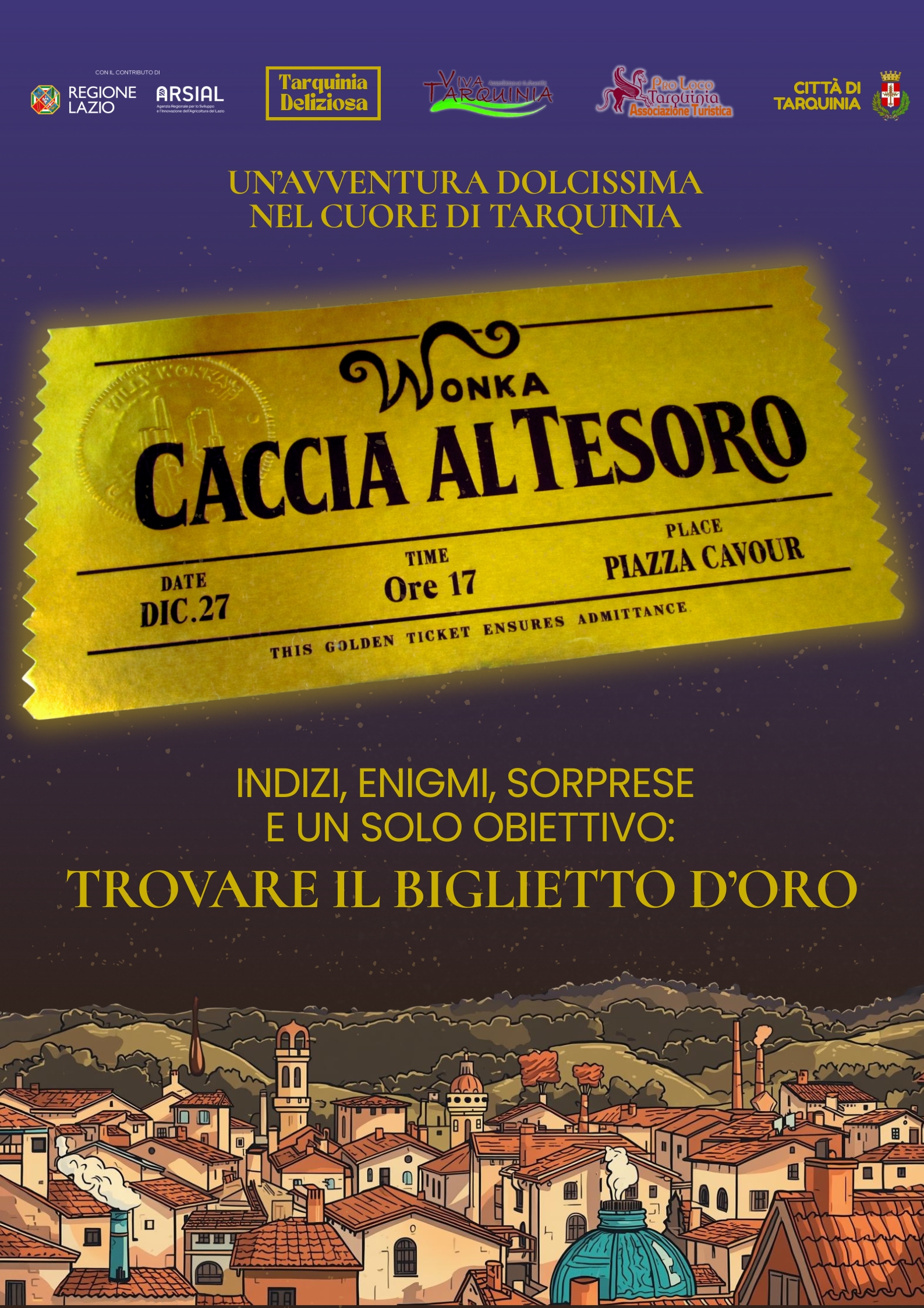 Tarquinia si prepara a vivere un pomeriggio di gioco, fantasia e spirito natalizio con la “Caccia al Tesoro di Willy Wonka”, un evento pensato per famiglie, bambini e curiosi di tutte le età, in programma venerdì 27 dicembre, con partenza alle ore 17 da Piazza Cavour.