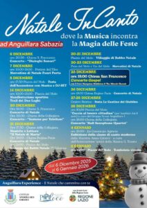 Il Natale ad Anguillara Sabazia offre un ricco programma di eventi che spaziano da concerti, iniziative culturali ed enogastronomiche creando un’atmosfera festosa nel borgo e sul lungolago per tutti, con eventi che si svolgono fino all’Epifania in collaborazione tra la Pro Loco Anguillara Sabazia 2007 A.P.S. e l’Amministrazione Comunale.