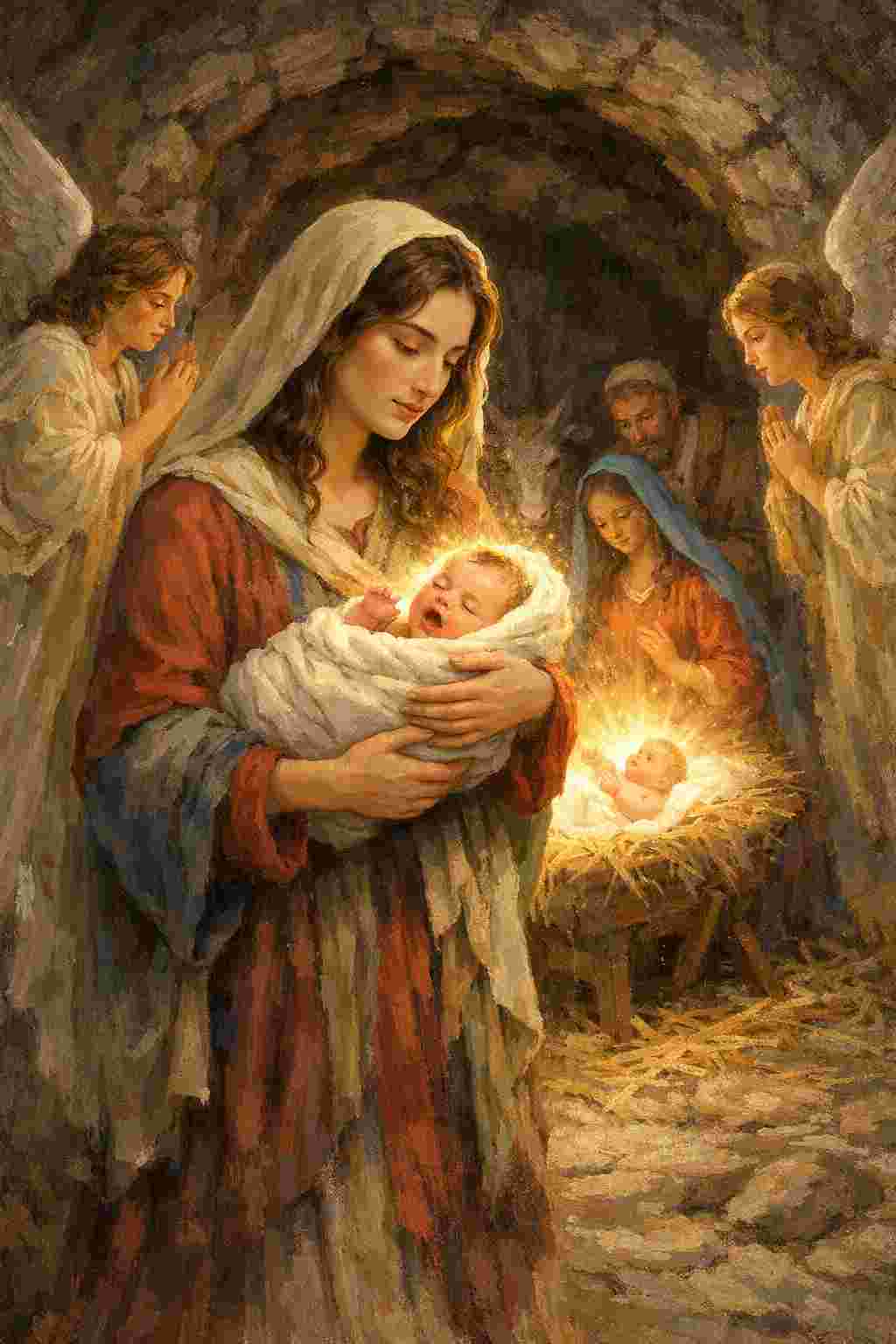Il mattino seguente tornò alla grotta. Camminava piano, cullando la pietra come fosse già un figlio promesso dal cielo. Gli angeli, vedendo quel moto disarmato di tenerezza, si scambiarono un muto consenso e le aprirono il varco, come si apre una porta sacra a chi porta un’offerta del cuore. Quando giunse davanti a Maria, il prodigio si compì con la dolcezza improvvisa di un lampo benigno: la pietra fremette, prese calore, poi, come destata da un sonno che durava dall’alba dei tempi, starnutì. Dalle fasce sbocciò un bambino, luminoso come una stella appena forgiata nel respiro di Dio.