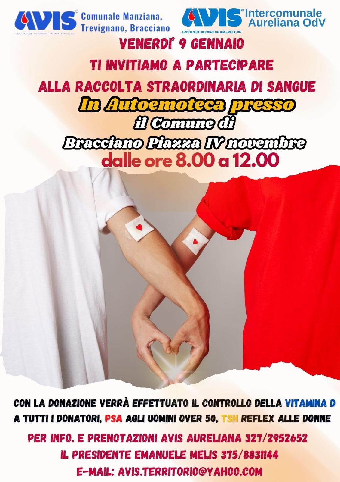 Venerdì 9 Gennaio dalle ore 8 alle 12, si svolgerà a Piazza IV Novembre, la giornata di donazione di sangue per i soci già iscritti e per tutti coloro che si recheranno a digiuno, con possibilità di analisi aggiuntive vitamina D, Psa, Tsh Reflex.