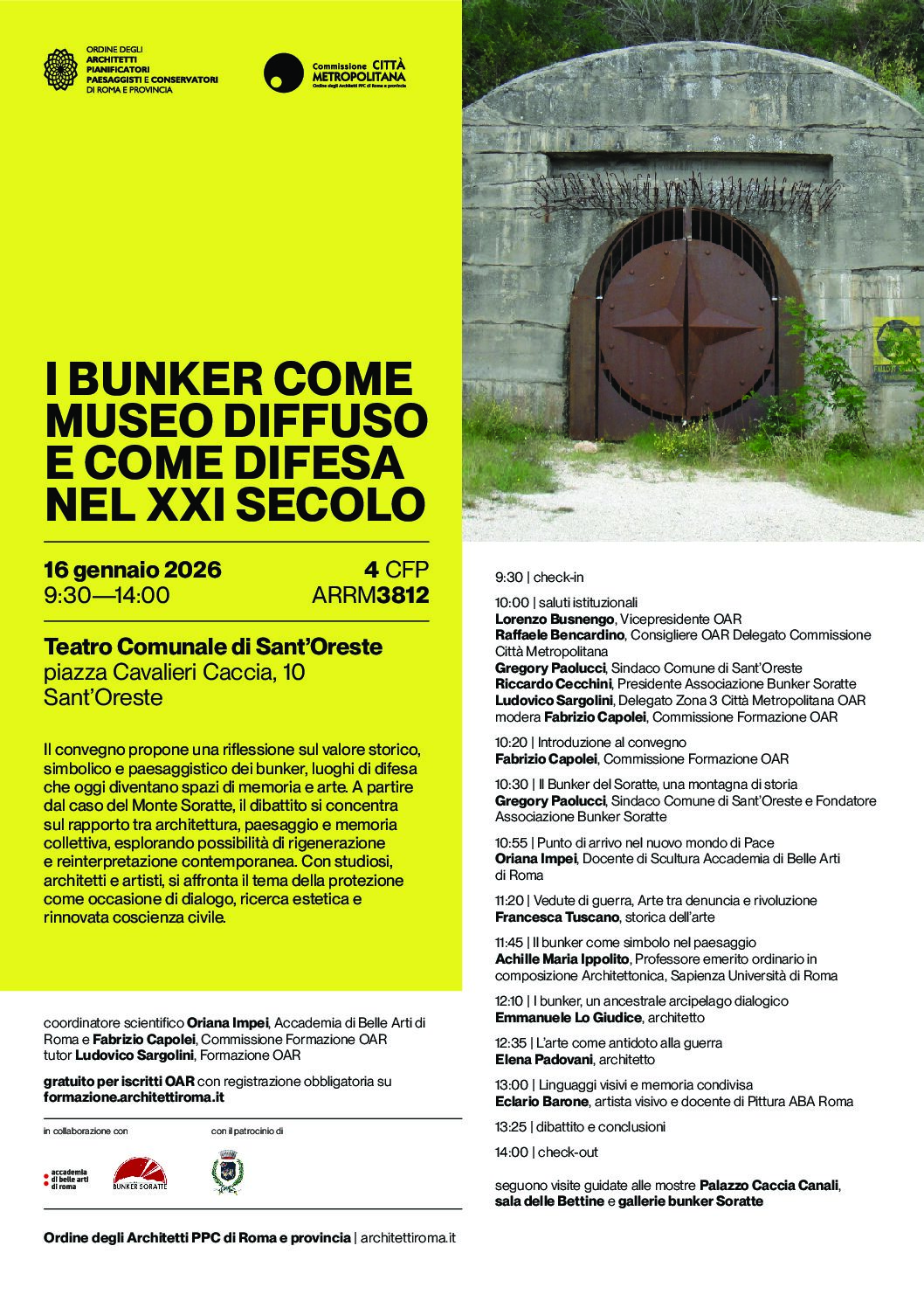 Il convegno propone una riflessione sul valore storico, simbolico e paesaggistico dei bunker, luoghi di difesa e oggi spazi di memoria e di arte. A partire dal caso del Monte Soratte, il dibattito si concentra sul rapporto tra architettura, paesaggio e memoria collettiva, approfondendo le possibilità di rigenerazione e reinterpretazione contemporanea di questi manufatti. Attraverso gli interventi di studiosi, architetti e artisti, il tema della protezione si trasforma in occasione di dialogo, di ricerca estetica e di rinnovata coscienza civile, per restituire al bunker un significato nuovo: da spazio di guerra a luogo di pace, cultura e partecipazione.