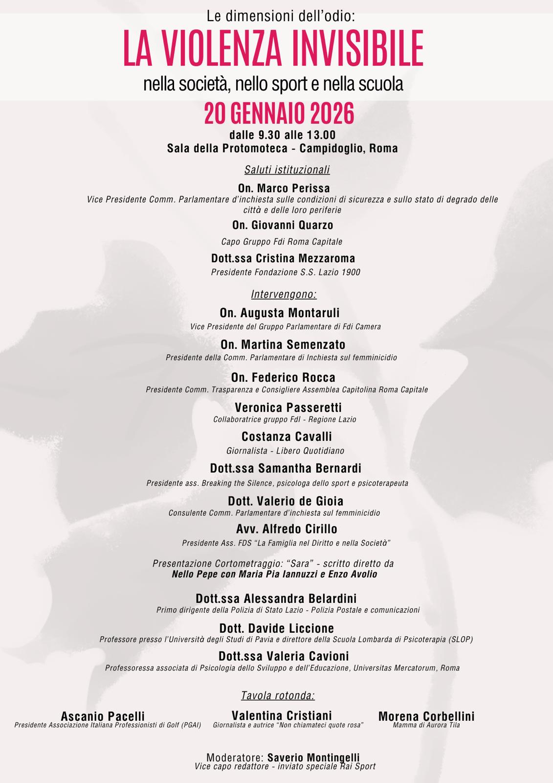 I lavori, in programma dalle 9.30 alle 13.00, vedranno la partecipazione di rappresentanti del mondo politico, sportivo e accademico, delle forze dell’ordine, dell’informazione e della società civile. Dopo i saluti istituzionali, tra cui quelli della Dott.ssa Cristina Mezzaroma, che porterà la propria esperienza alla guida di una grande istituzione sportiva come la Fondazione S.S. Lazio 1900, seguiranno interventi che affronteranno il tema sotto diversi profili: degrado sociale e urbano, linguaggio dell’odio e manipolazione emotiva, pressioni psicologiche nello sport e nella scuola, violenza di genere e prevenzione culturale.