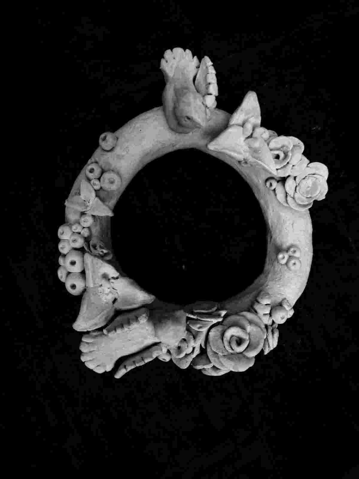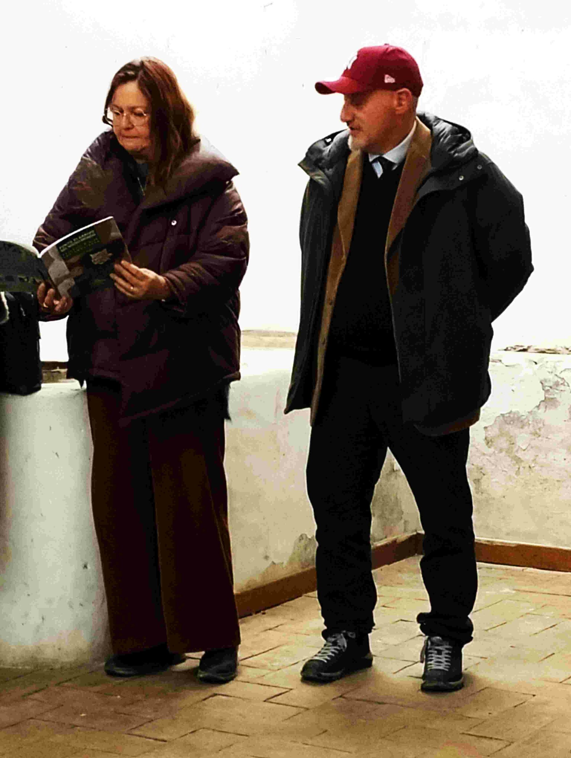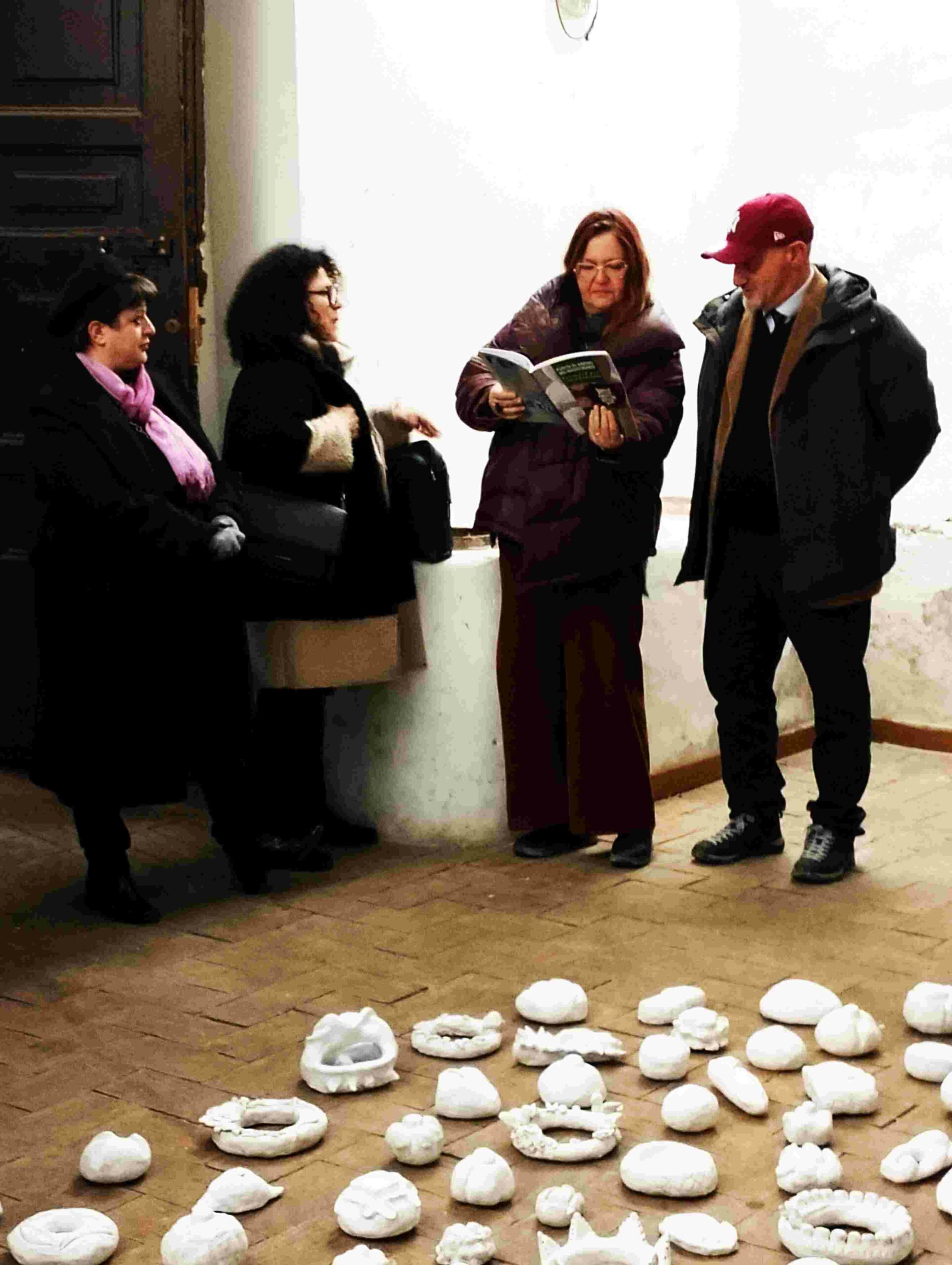 Tra i momenti più intensi della giornata, ciò che ha catturato l’attenzione unanime del pubblico, dal sindaco alla curatrice della mostra, è stata l’installazione site specific realizzata dagli studenti delle ex prime e seconde classi liceo “Paciolo” di Anguillara Sabazia. Un’opera corale, nata sotto la guida attenta delle professoresse Viviana Ravaioli e Patrizia Santoro, che ha trasformato un antico pavimento in cotto del XVI secolo in un paesaggio simbolico: una spirale composta da centinaia di pani in argilla cruda, candidi come neve, posti a terra quasi a dialogare con il caldo del rosso pavimento, che si origina da un unico pane in argilla scura, il “lievito madre”, metafora di nascita e memoria.