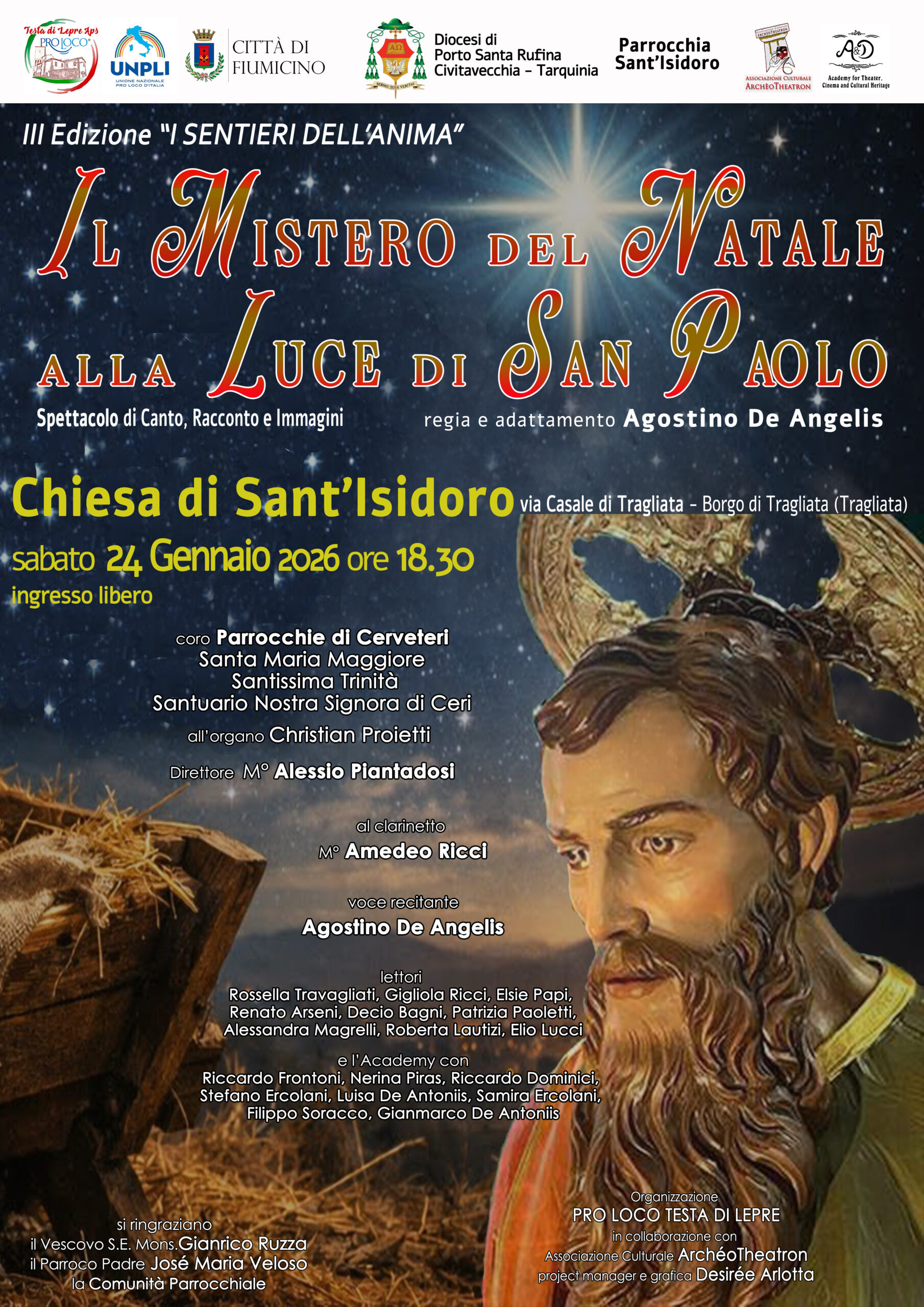 Nella cornice solenne e accogliente della Chiesa di Sant’Isidoro nel Borgo di Tragliata del Comune di Fiumicino, sabato 24 gennaio 2026 alle ore 18.30, andrà in scena lo spettacolo di Canto, Racconto e Immagini “Il Mistero del Natale alla Luce di San Paolo”, per la regia e adattamento di Agostino De Angelis. Uno spettacolo che si propone come un vero e proprio itinerario spirituale nel messaggio del Natale, dove recitazione, musica e canto diventano strumenti di annuncio e di meditazione sul mistero della Natività, letto idealmente alla luce del pensiero di San Paolo Apostolo.