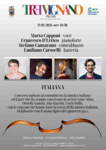 Quale titolo più appropriato se non “ITALIANA” per questo concerto del Trevignano Proms che porta in sala un quartetto d’eccezione: Marta Capponi – voce, Francesco D’Errico – pianoforte, Stefano Cantarano – contrabbasso e Emiliano Caroselli – batteria.
