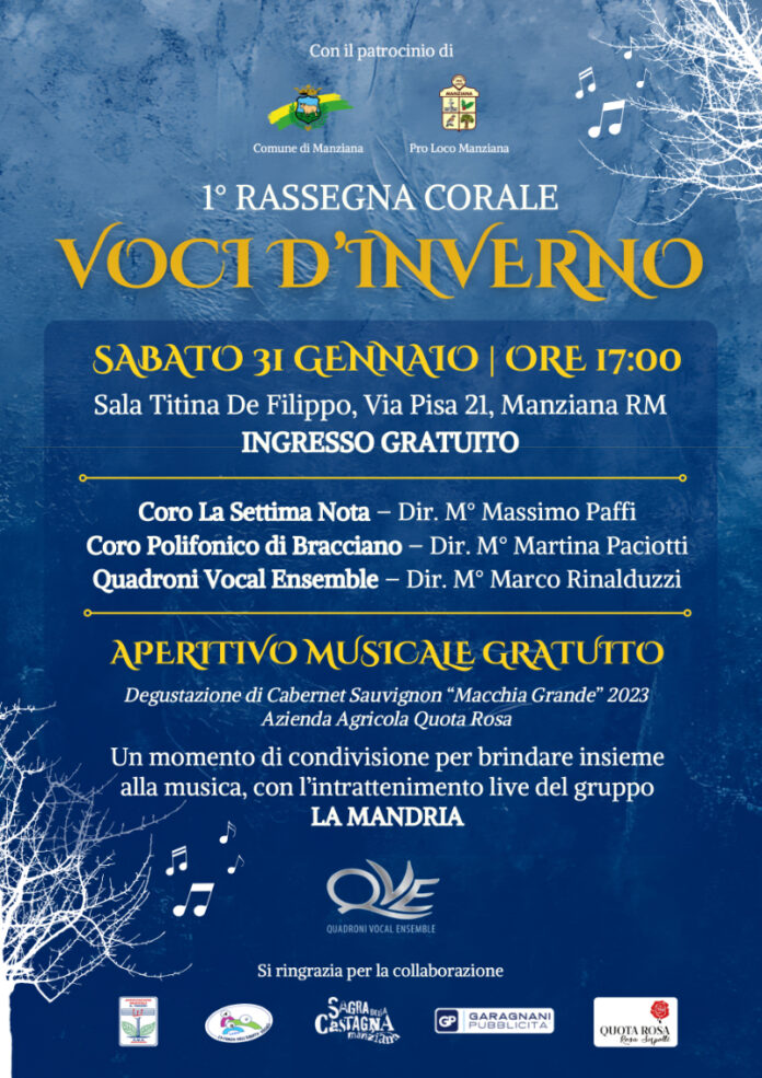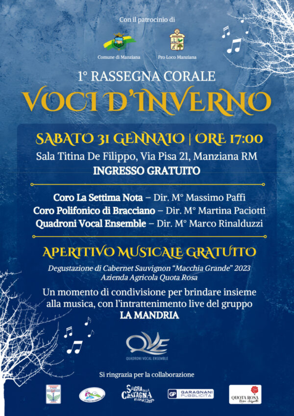 Arricchire l’offerta culturale locale e colmare l’assenza di un appuntamento dedicato alla musica corale: da questa esigenza nasce la rassegna “Voci d’inverno”, nuova iniziativa patrocinata dal Comune di Manziana e dalla Pro Loco Manziana, pensata per valorizzare un genere musicale, finora poco rappresentato nel panorama culturale cittadino.