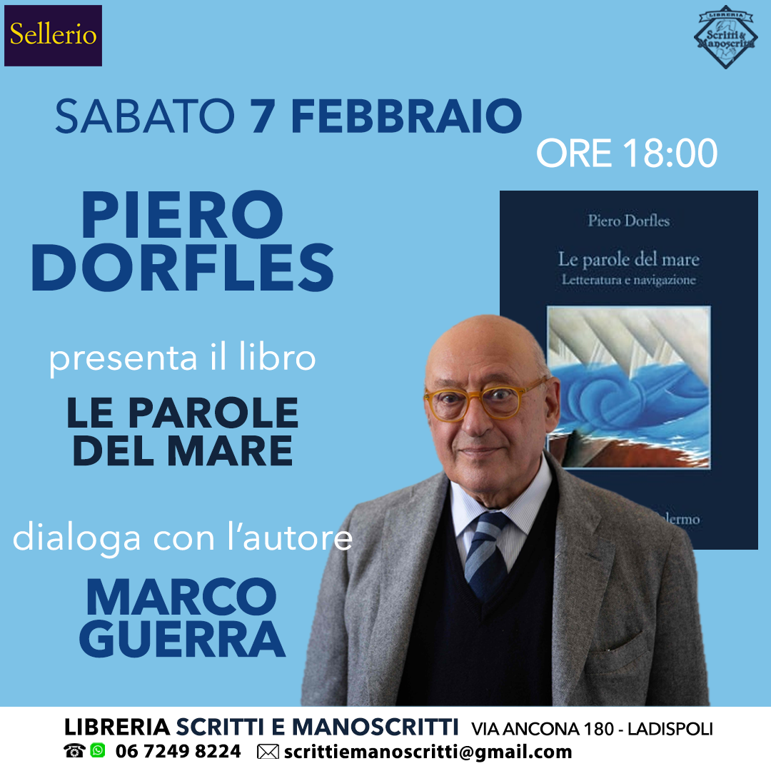 Sabato 7 febbraio, alla libreria Scritti e Manoscritti di Ladispoli, alle 18.00 il Professor Piero Dorfles presenta il suo ultimo libro, Le parole del mare, letteratura e navigazione, Sellerio Editore