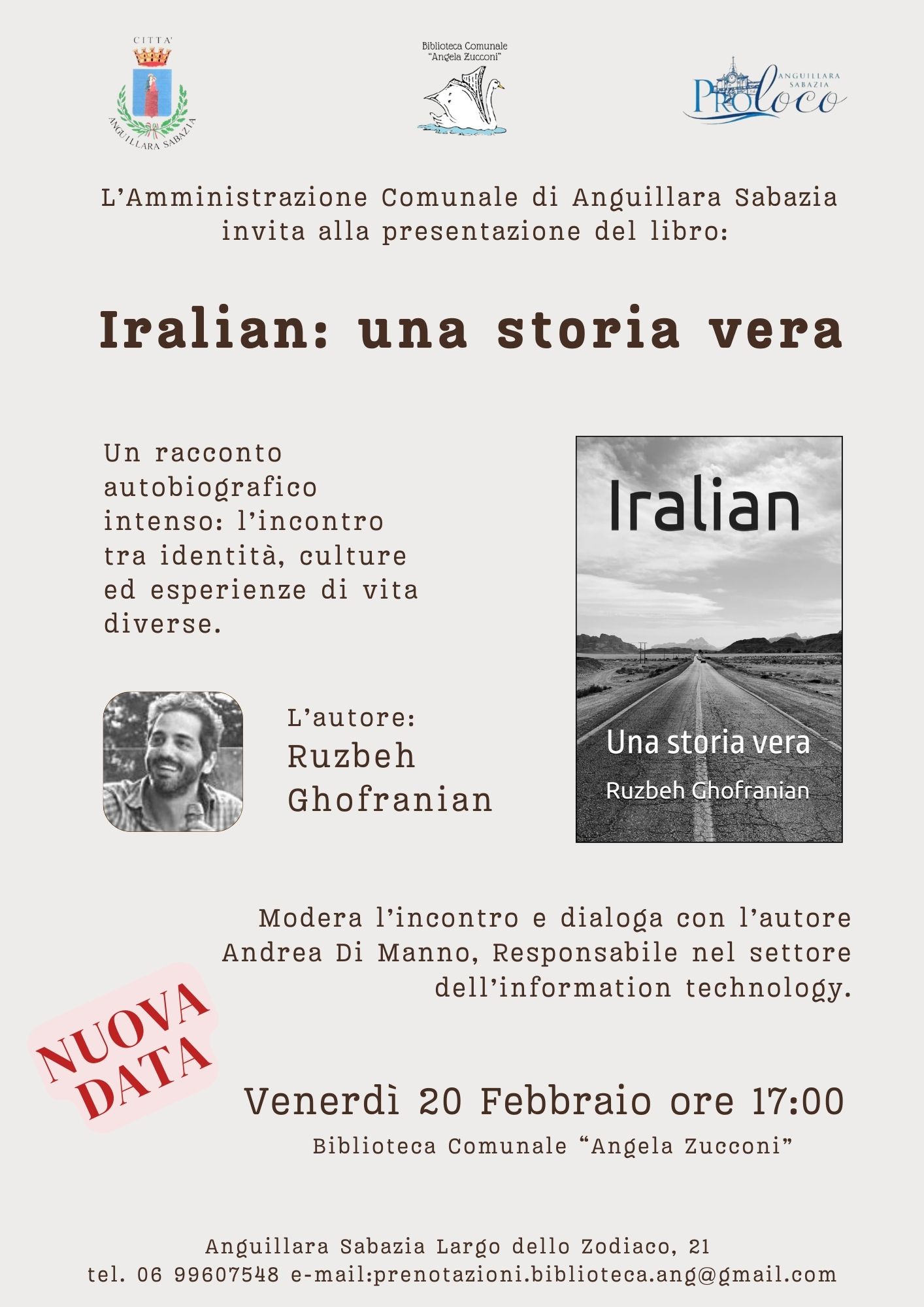 L’Amministrazione Comunale di Anguillara Sabazia e la Biblioteca Comunale “Angela Zucconi” Vi invitano alla presentazione del libro “Iralian: una storia vera” di Ruzbeh Ghofranian.