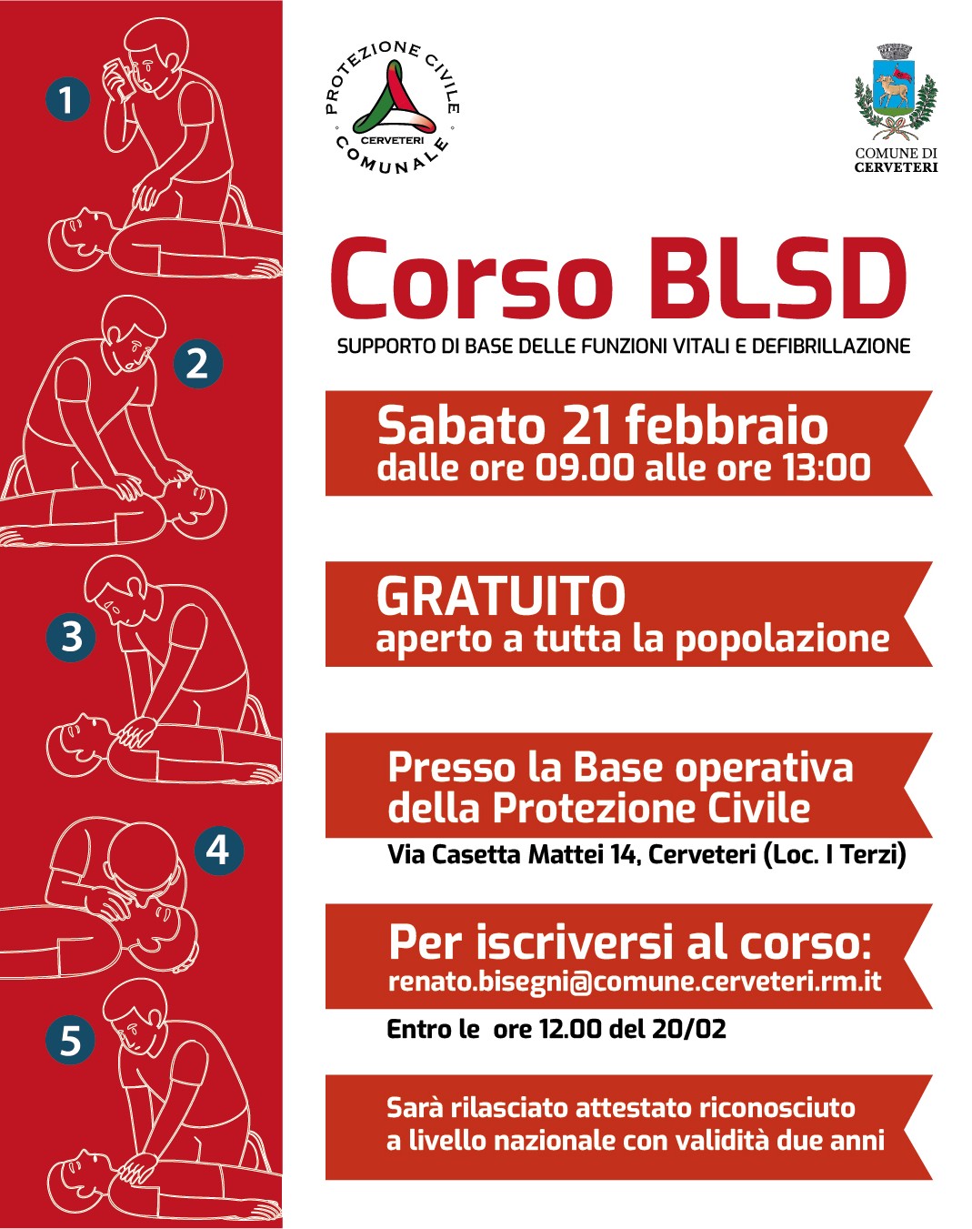 “Grazie alla disponibilità e all’abnegazione dei Volontari del Gruppo Comunale di Protezione Civile di Cerveteri, avremo una mattinata dedicata alla formazione e alla conoscenza delle norme basilari di primo soccorso, manovre che le cronache ci dimostrano essere davvero fondamentali in caso di emergenza – ha dichiarato il Sindaco di Cerveteri Elena Gubetti – ulteriore elemento che mi spinge ad invitare le persone a partecipare e ad iscriversi, è che al termine, sarà rilasciato attestato con validità di due anni sull’intero territorio nazionale. Un’occasione davvero importante messa a disposizione dalla nostra Protezione Civile che ringrazio per il lavoro che sempre svolgono nel territorio e per l’impegno profuso in materia di formazione e prevenzione”.