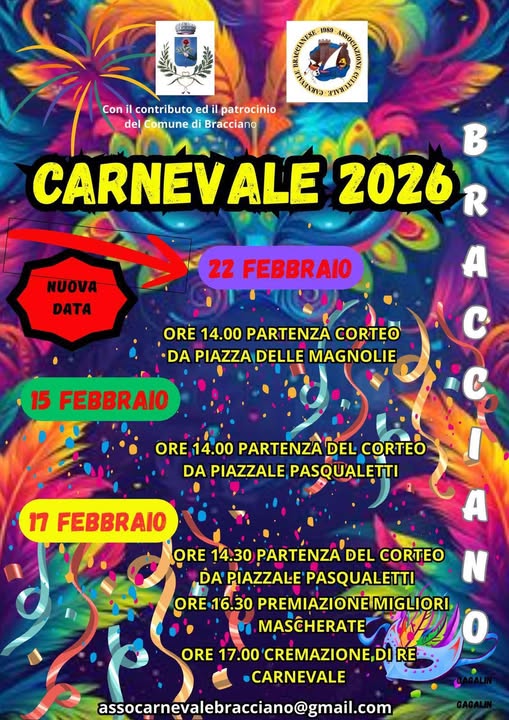 Dopo il rinvio del primo appuntamento, in segno di vicinanza e rispetto per i cittadini colpiti dallโemergenza meteo, torna il Carnevale 2026 ad animare e colorare le vie del paese toccando il centro e Bracciano nuova.