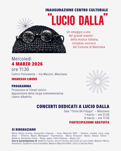 A rendere ancora più speciale questo momento saranno i musicisti che hanno scelto di esibirsi gratuitamente nei concerti dedicati a Lucio Dalla, in programma il 7 e l’8 marzo. A loro va il nostro più sincero grazie per aver voluto condividere con tutta Manziana la loro arte e la loro passione.