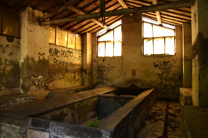 Pur non presentando problemi strutturali rilevanti, la struttura mostra segni evidenti di deterioramento. Le murature in pietra risultano in parte erose e, nel tempo, sono state oggetto di interventi con materiali non coerenti con quelli originari. Anche la copertura in legno evidenzia segni di usura, mentre all’interno sono presenti intonaci deteriorati, fenomeni di umidità e tracce di vandalismo. Inoltre, la vasca centrale, elemento simbolico del manufatto, appare compromessa da depositi e distacchi superficiali. Si tratta di condizioni tipiche di un edificio storico rimasto a lungo senza manutenzione, che rendono oggi necessario un intervento attento e rispettoso per restituire piena dignità e leggibilità a questo luogo della memoria collettiva.