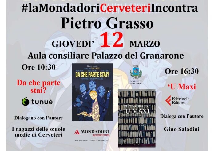 Una giornata dedicata alla legalità e alla lotta alle mafie. Cerveteri si appresta ad accogliere in città un ospite d’eccezione: giovedì 12 marzo, alle ore 10:30 e alle ore 16:30 all’interno dell’Aula Consiliare del Granarone interverrà Pietro Grasso, ex Magistrato e Procuratore Nazionale Antimafia, nonché ex Presidente del Senato, per incontrare studenti e cittadini e per presentare i suoi due ultimi libri, il graphic novel “Da che parte stai?” e il libro verità sul Maxi-Processo “’U Maxi”. La giornata è organizzata dalla Mondadori Bookstore di Cerveteri ed è sostenuta dall’Amministrazione comunale di Cerveteri con il Patrocinio dell’Assessorato alla Cultura.
